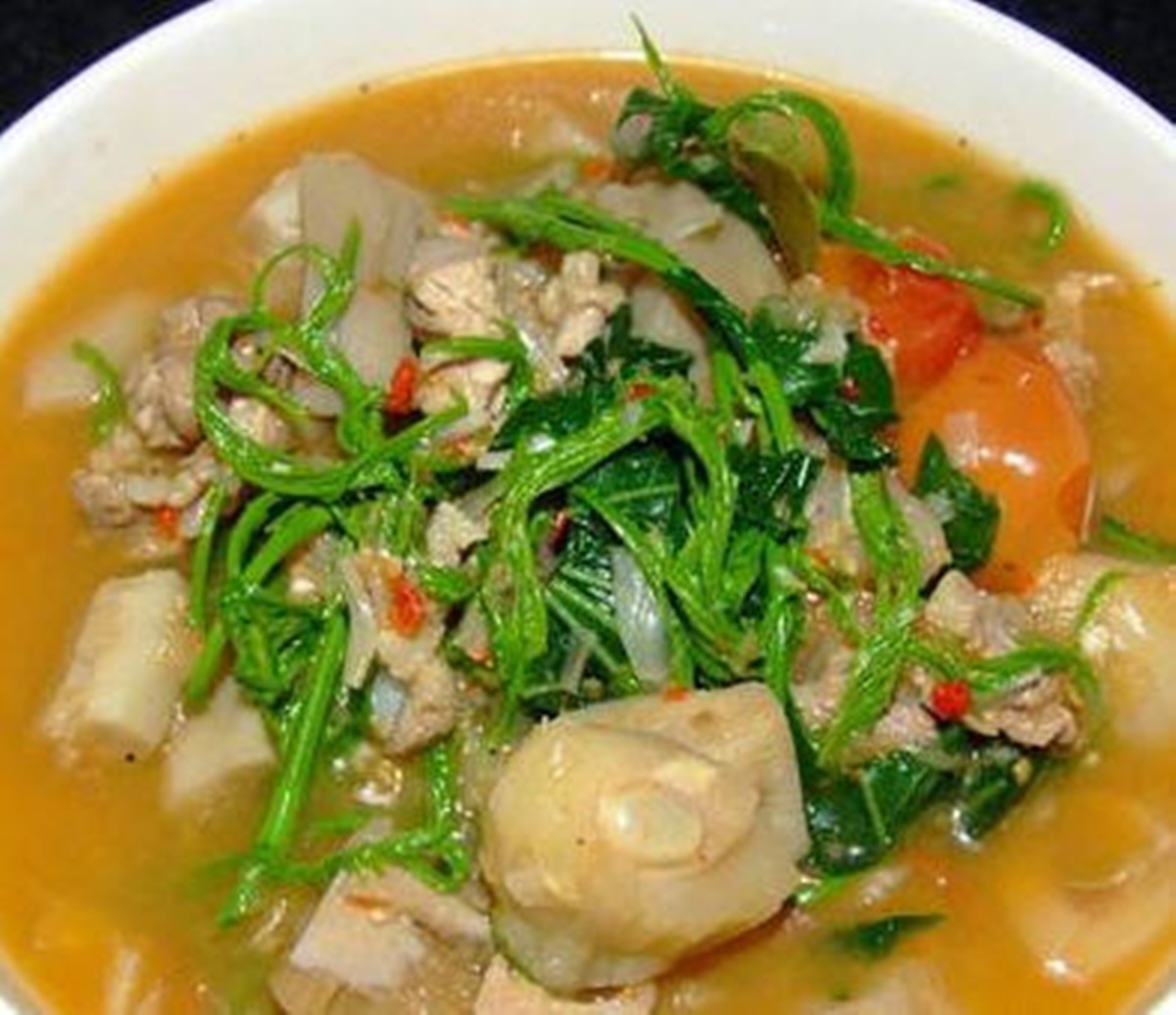 - หลังจากนั้นต้มน้ำเดือด และละลายเครื่องแกงลงไปในน้ำเดือด ใส่ซี่โครงหมูที่เตรียม ใส่ขนุน ต้มจนนิ่ม จากนั้นใส่มะเขือเทศ, ชะอม, ใบชะพลูคนให้เข้ากัน ตั้งให้ผักสุก