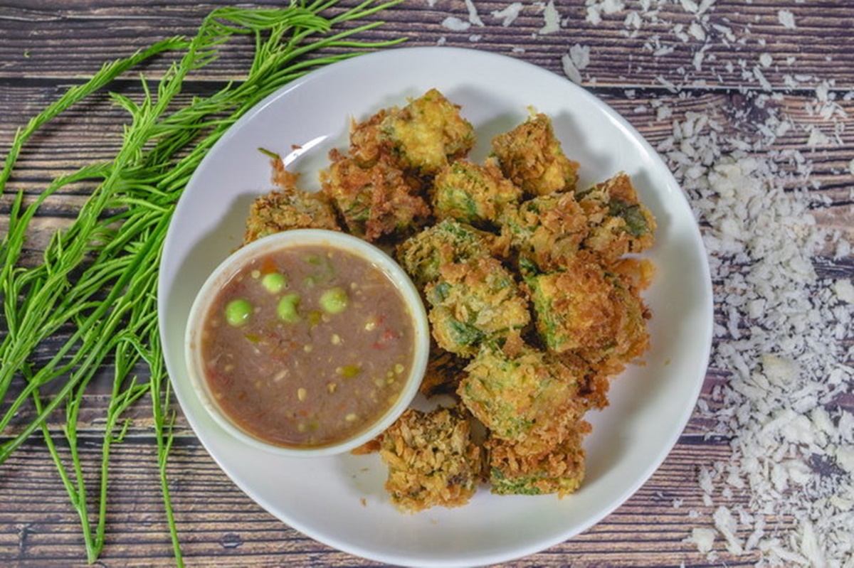 - ตอกไข่ใส่ชามตีไข่ให้แตกเข้ากันดี นำไข่ชะอมที่หั่นมาชุบลงในไข่แล้วเอาไปชุบเกล็ดขนมปัง