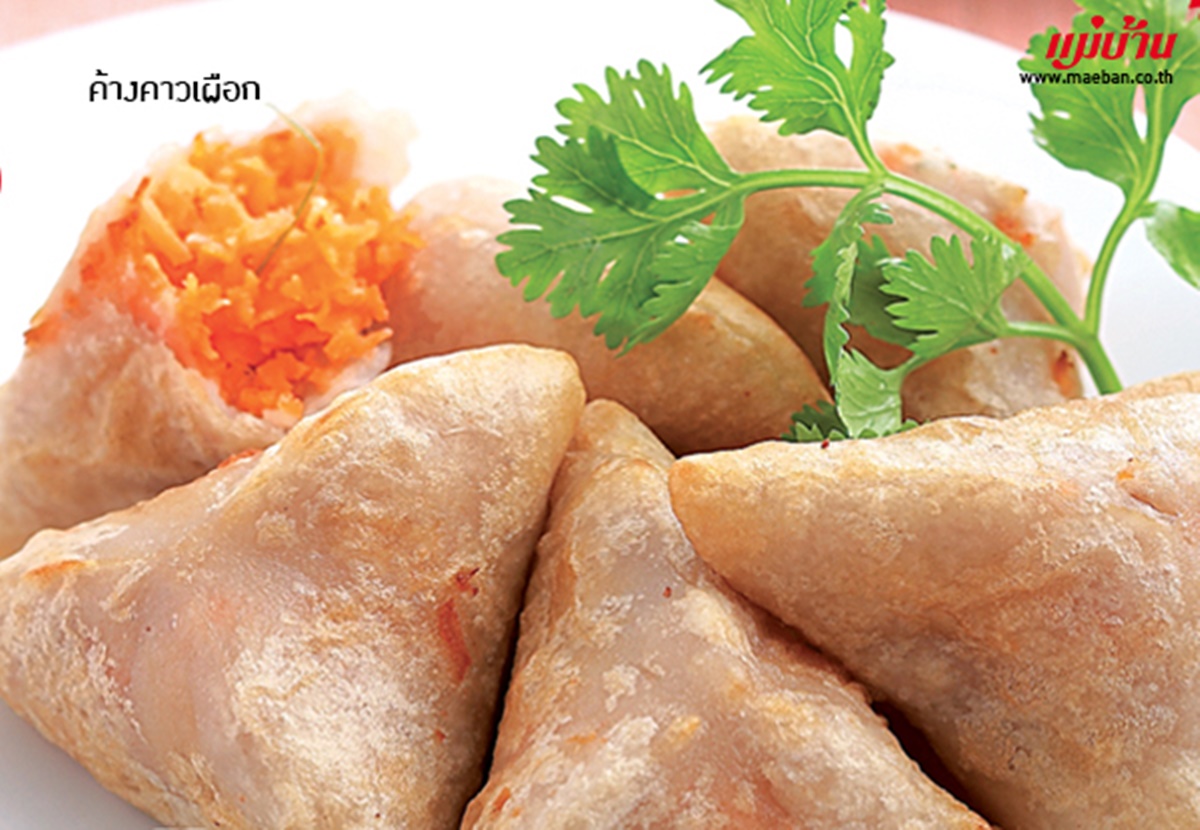 - ห่อให้เป็นรูปทรงสามเหลี่ยม นำลงทอดในน้ำมันพืชร้อนจนสุกเหลือง ตักขึ้นพักให้สะเด็ดน้ำมัน จัดใส่จานเสิร์ฟ