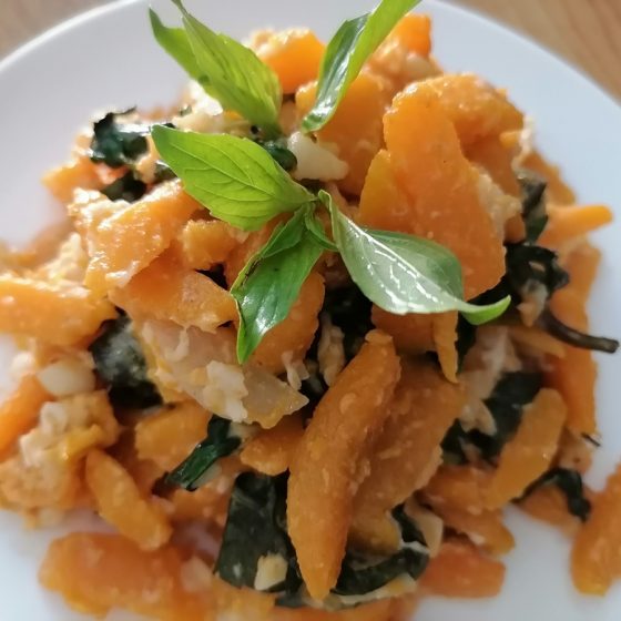 ฟักทองบัตเตอร์นัทผัดไข่โหระพา