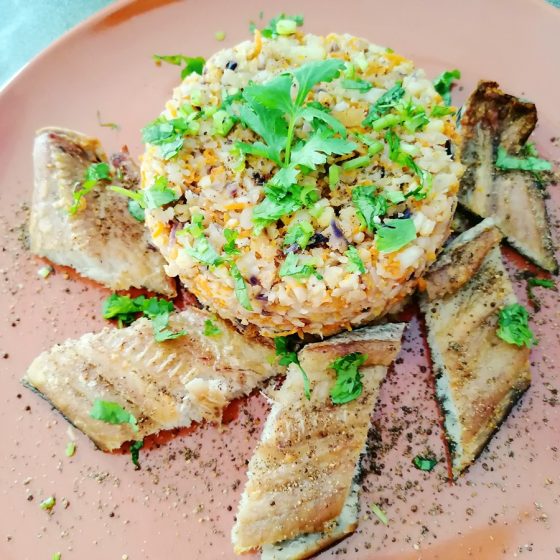 ข้าวดอกกะหล่ำ ปลาช่อนอบ