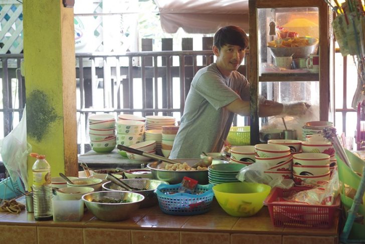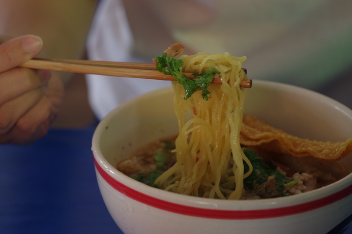 ร้านต่อมา “ไผ่เหลือง” ร้านนี้เป็นร้านตามสั่งง่ายๆ ในราคา 30-40 บาท ตั้งอยู่บนถนนน้ำคือ ภายในร้านมีที่จอดรถหายห่วง ความโดดเด่นของร้านนี้ คือ ใช้น้ำมันหมูทำอาหาร บางจานก็ผัดกากหมูใส่มาด้วย ลาภปากคนรักกากหมู จานที่ชวนให้ชิม คือ กะเพราตับ และ ข้าวกะเพราคลุก จานหลังอาจมันเลี่ยนไปนิด แต่รสชาติอร่อยเด็ดจริงๆ แนะนำว่าอย่าไปเย็นมาก เพราะตกบ่าย ร้านก็ปิดแล้ว