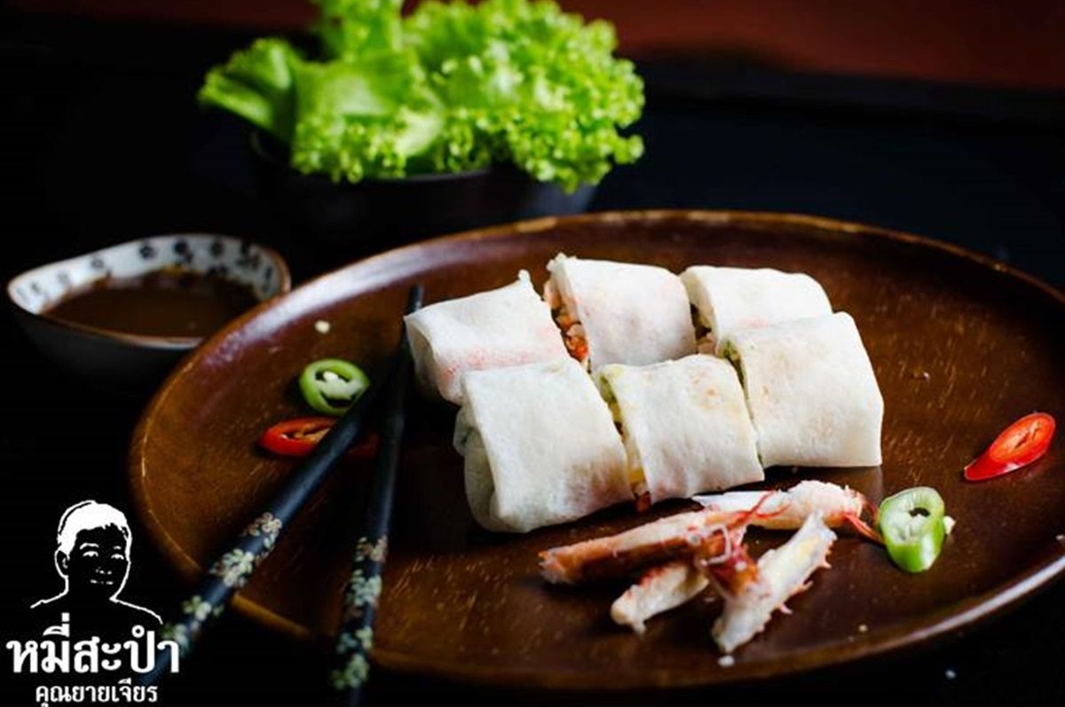 จานถัดมา “หอยทอด” สูตรร้านหมี่สะปำ เป็นเมนูที่คุณยายเจียรคิดค้นและดัดแปลงจากหอยทอดทั่วไป เปลี่ยนจากหอยนางรมมาใช้ “หอยกระติบ” เป็นหอยที่มีอยู่ในท้องถิ่น จ.ภูเก็ต คล้ายหอยนางรมแต่ตัวเล็กกว่า วิธีการปรุงของคุณยายจะแยกตัวแป้งออกจากตัวหอย เพื่อให้ลูกค้าได้สัมผัสความกรอบของแป้งทอดห่อเป็นแท่งใหญ่สวยงาม กินคู่กับน้ำจิ้มของทางร้าน ลงตัวเข้ากันเป็นอย่างดี รสชาติหลักๆ จะมาจากซอสพริกของทางร้าน