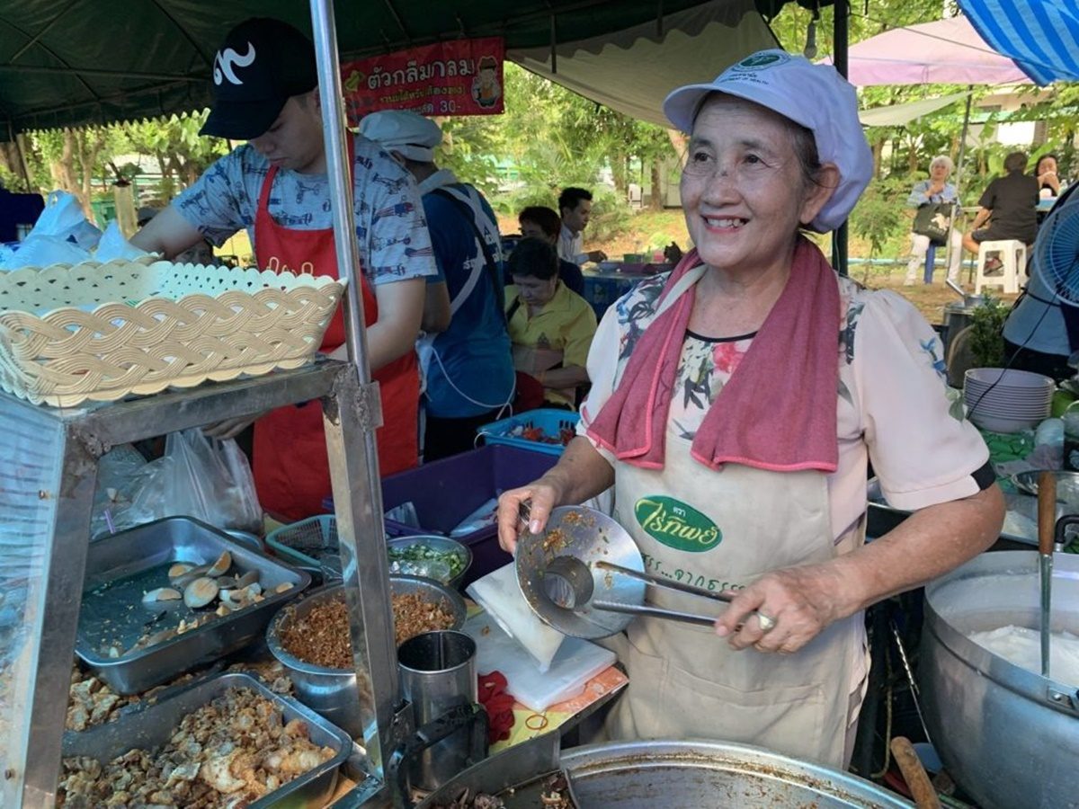 เมื่อเดินเข้าไปได้ถึงกลางตลาด ที่สะดุดตาเห็นจะเป็นแถวคิวที่ยาวเหยียด ที่ต่างก็มารอซื้อกวยจั๊บของ ป้าเล็ก-อนันต์ ใจแสน วัย 57 ปี เจ้าของร้านกวยจั๊บเมืองนนท์ ที่ขะมักเขม้นทำออร์เดอร์อยู่หน้าหม้อซุป