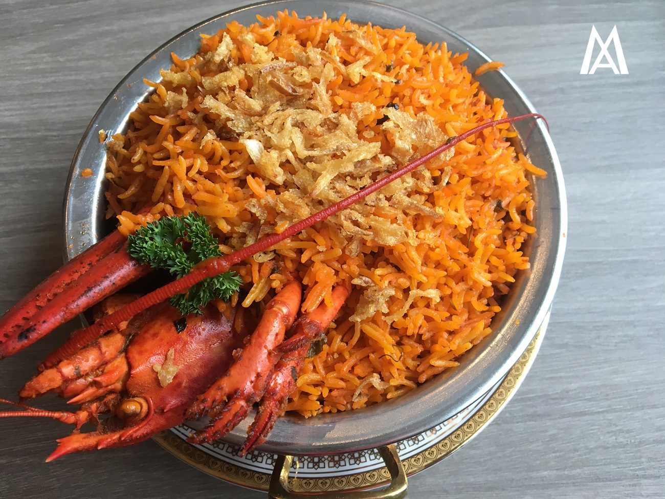 ข้าวหมกร้อนๆ โชยกลิ่นหอม กับ เมนล็อบสเตอร์ที่หมกตัวอยู่ในข้าวบาสมาติเม็ดเรียวนั้น ยั่วน้ำย่อยไม่หยอก เสิร์ฟพร้อมกับผัก 2 สไตล์ คือ ผักสด กับผักดอง และ ซอส 3 ชนิด