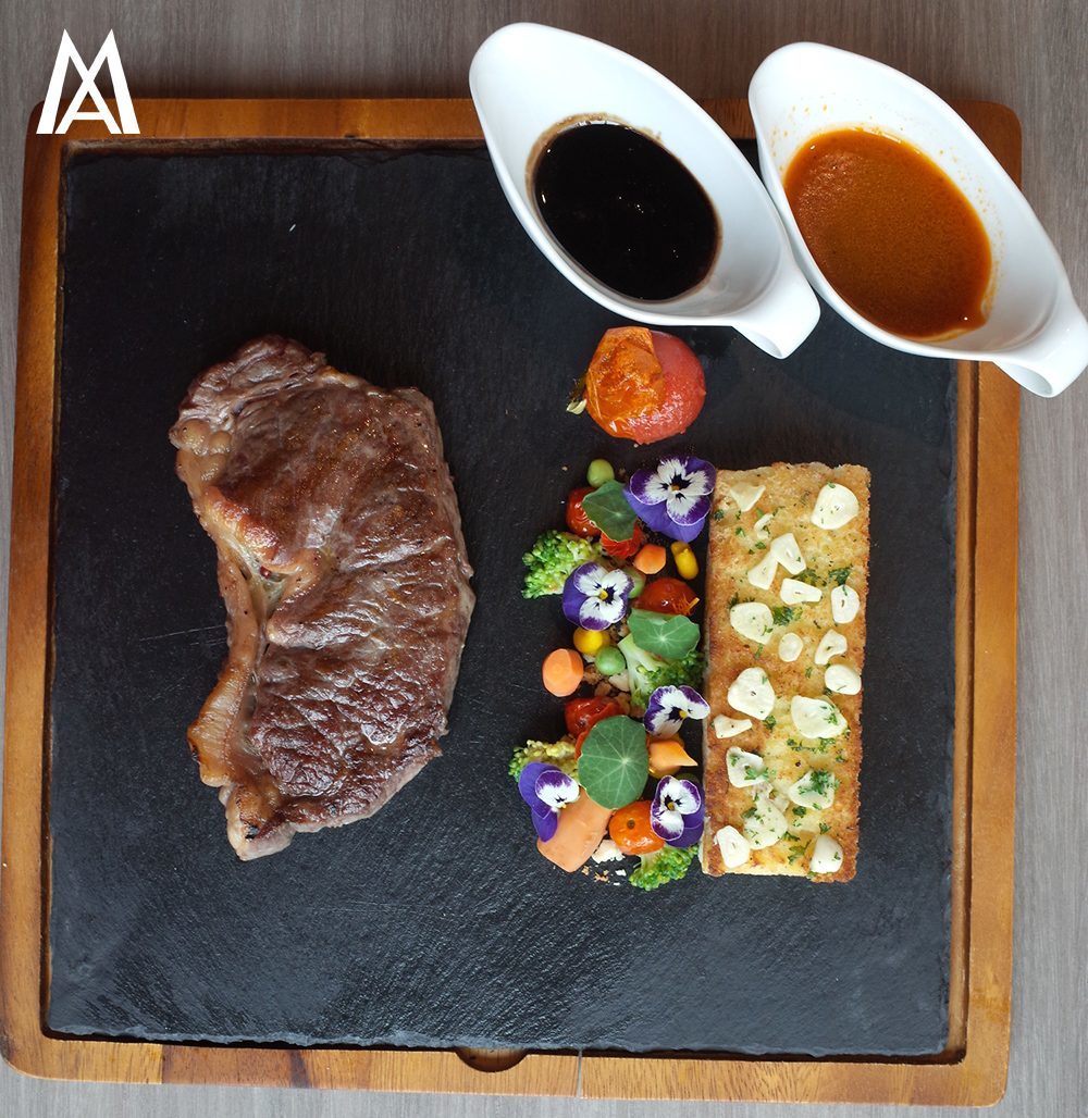 สเต๊กเนื้อเสิร์ฟพร้อมซอสบัลซามิก มีกลิ่นหอม รสชาติออกเปรี้ยวหวาน เสริมด้วยน้ำเกรวี่ที่เคี่ยวกระดูกวัวแท้ๆ นานถึง 8 ชั่วโมง