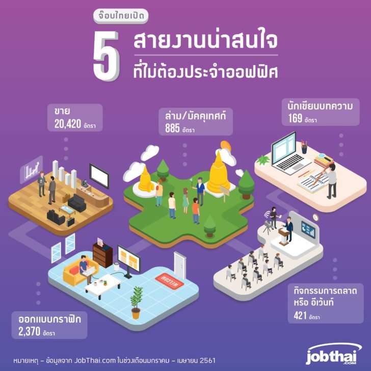 “จ๊อบไทยดอทคอม (JobThai.com)” ได้ทำการรวบรวมข้อมูลตำแหน่งงานระหว่างเดือนมกราคม – เมษายน 2561 พบ 5 สายงานน่าสนใจที่ไม่ต้องนั่งประจำออฟฟิศและเป็นที่ต้องการของตลาดแรงงาน