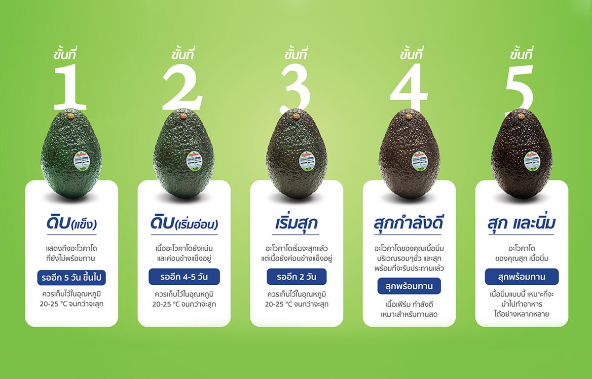 หลังจากทำความรู้จักกับอะโวคาโดพันธุ์สายพันธุ์ HASS แล้ว มาดูเคล็ดลับวิธีการเลือกอะโวคาโดให้สุกกำลังดี มีเนื้อสีสวย และไม่เละจนเกินไป ด้วยการสังเกตง่ายๆ ตามขั้นความสุกกันค่ะ