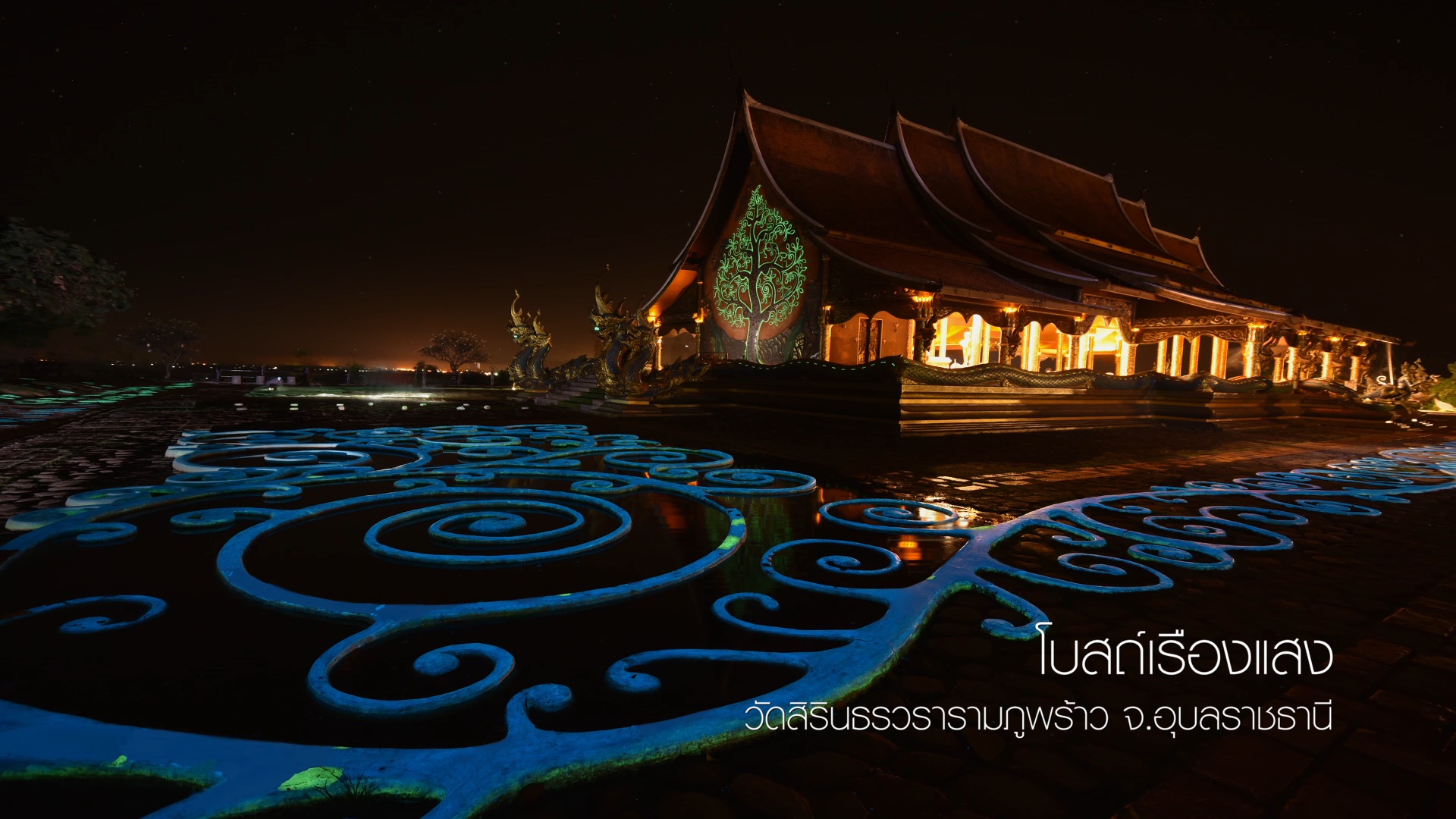 “โบสถ์เรืองแสง วัดสิรินธรวรารามภูพร้าวจ.อุบลราชธานี” ยามพลบค่ำงานพุทธศิลป์รูปต้นไม้ที่ผนังด้านหลังโบสถ์จะค่อยๆ เปล่งประกาย เกิดเป็นรูปต้นไม้เรืองแสงอันโดดเด่นท่ามกลางความมืด จนผู้คนขนานนามวัดแห่งนี้ว่า “โบสถ์เรืองแสง”