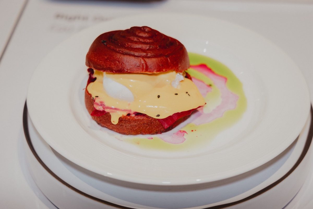 ที่ประกอบด้วยทาร์ทาร์หอยเชลล์ฮอกไกโด เสิร์ฟพร้อมครีมรมควันและบีทรูตซิฟฟองนุ่ม ด้านบนแต่งด้วยบีทรูตอบ น้ำมันเฮิร์บทารากอน และผงบีทรูต เพิ่มสีสันและรสสัมผัสในทุกคำ - Egg Benedict on Red Brioche