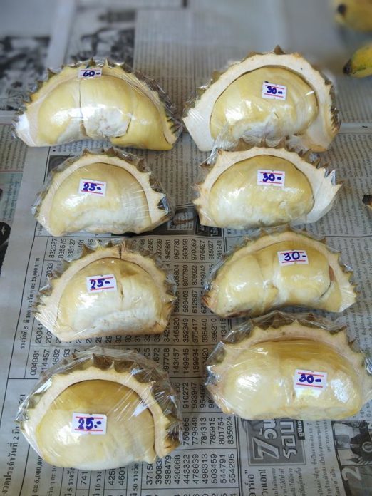 โดยภาพที่เห็นแล้วคนรักทุเรียนถึงกับอยากลิ้มชิมรส ก็คือ ภาพทุเรียนไซต์มินิ กับราคาที่แสนจะมิตรภาพ โดยพบว่า เป็นการขายทุเรียนแบบปอกเปลือกแล้ว เหลือแต่พูทุเรียนกับเปลือกด้านใต้เล็กๆ โดยราคาเริ่มต้นอยู่ที่เพียง 25 บาท เท่านั้น โดยมีหลายราคาให้เลือก ตั้งแต่ 25 บาท ไปจนถึง หลัง 100 ก็มี ส่วนใครที่อยากชิม ก็แวะเวียนไปได้ที่ จ.ระยอง