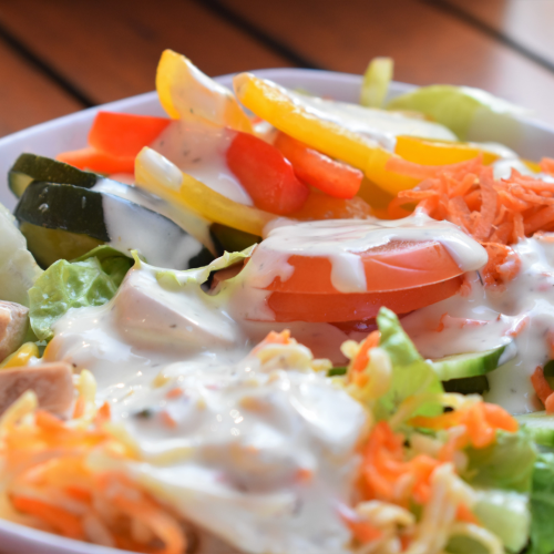 พร้อมน้ำสลัดโฮมเมดหลากหลายรสชาติ ทานแล้วไม่เลี่ยน กินแล้วต้องติดใจ สูตรดั้งเดิมมีมายาวนานกว่า 20 ปี