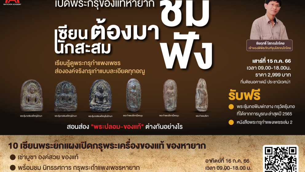 โดย อ.ชัยฤทธิ์ โสภณโภไคย เจ้าของพิพิธภัณฑ์ขุนโสภณโภไคย กำแพงเพชร จะนำพระองค์เบญจภาคีของกรุกำแพงเพชร และพระกรุกำแพงเพชรกว่า 70 องค์ มาสอนวิธีการสังเกตว่าเป็นองค์แท้หรือองค์ปลอม