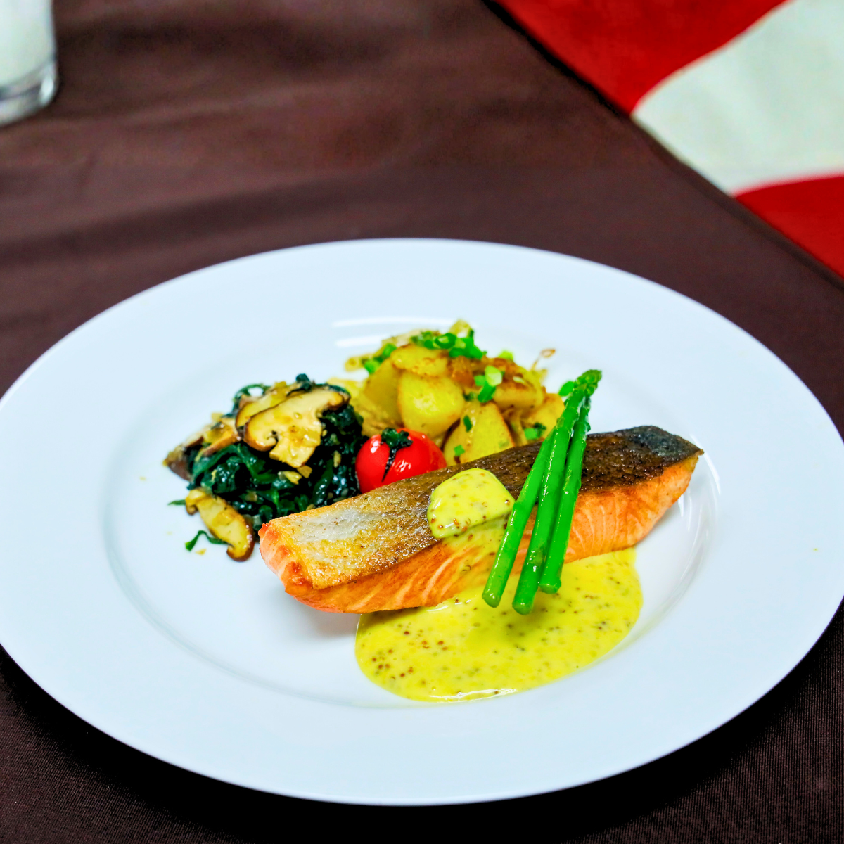 - มันฝรั่งผัดเนยหอมใหญ่ (องค์ประกอบในจาน แซลมอน)