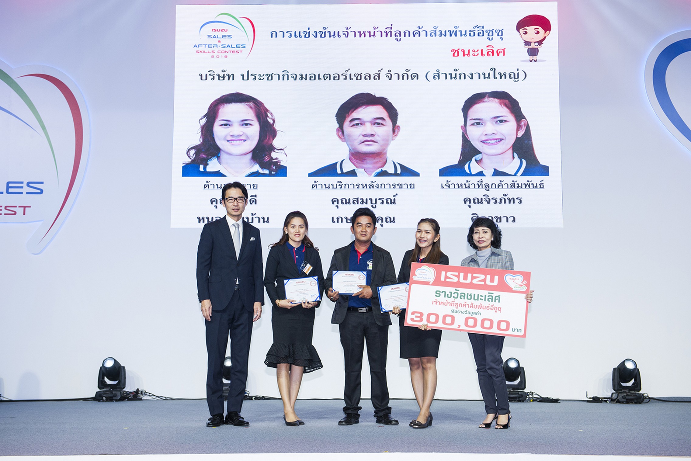 รางวัลชนะเลิศ เจ้าหน้าที่ลูกค้าสัมพันธ์อีซูซุ ได้แก่ คุณเรวดี หนองริมบ้าน (ด้านการขาย) คุณสมบูรณ์ เกษราธิคุณ (ด้านการบริการหลังการขาย) และ คุณจิรภัทร ศิลาขาว (เจ้าหน้าที่ลูกค้าสัมพันธ์) จากบริษัท ประชากิจมอเตอร์เซลส์ จำกัด (สำนักงานใหญ่) รับเงินรางวัล 300,000 บาท พร้อมโล่เกียรติยศ และประกาศนียบัตร