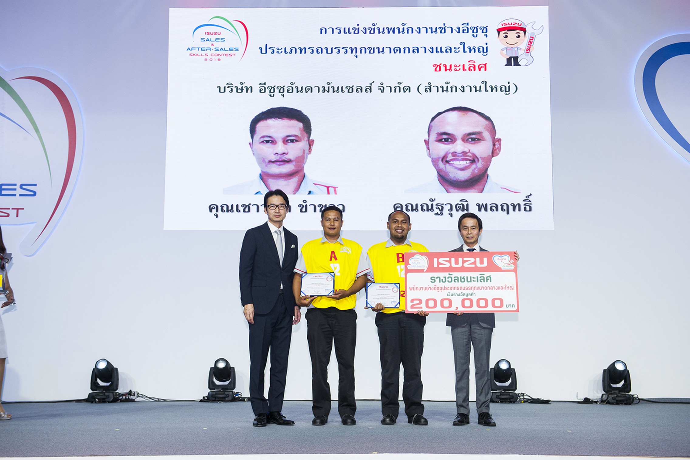 รางวัลชนะเลิศ พนักงานช่างประเภทรถบรรทุกขนาดกลางและใหญ่ ได้แก่ คุณเชาวลิต ขำขาว และคุณณัฐวุฒิ พลฤทธิ์ บริษัท อีซูซุอันดามันเซลส์ จำกัด (สำนักงานใหญ่) รับเงินรางวัล 200,000 บาท พร้อมโล่เกียรติยศ และประกาศนียบัตร