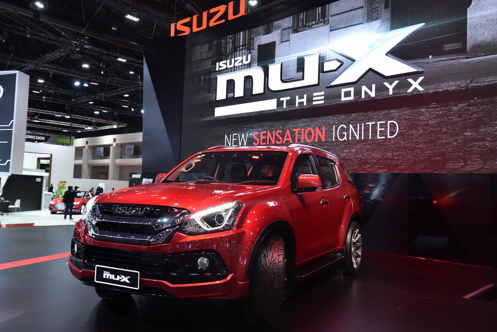 “อีซูซุมิว-เอ็กซ์ รุ่นพิเศษ! ดิ ออนิคซ์…จุดประกายความรู้สึกใหม่ในตัวคุณ (ISUZU MU-X THE ONYX… NEW SENSATION IGNITED)” รถอเนกประสงค์สุดหรูที่จะจุดประกายความรู้สึกใหม่ในตัวคุณ ด้วยความคม…เข้ม เร้าอารมณ์ แฝงความสปอร์ตด้วยชุดแต่ง ONYX DESIGN EDITION ห้องโดยสารโทนเข้มที่แต่งด้วย AMBIENT LIGHT ช่วยเพิ่มมิติในบรรยากาศ พร้อมความสะดวกสบายเต็มพิกัด ตอบสนองทุกสไตล์การขับขี่ด้วยระบบขับเคลื่อน 2 ล้อ มาพร้อมเครื่องยนต์อีซูซุ 1.9 และ 3.0 ดีดีไอ บลูเพาเวอร์ ให้สมรรถนะสูง แรงแต่ประหยัดน้ำมัน และเป็นมิตรต่อสิ่งแวดล้อมที่สุดในรถระดับเดียวกัน เอกสิทธิ์แห่งเทคโนโลยีดีเซลจากอีซูซุ พร้อมเพิ่มความมั่นใจด้านความปลอดภัยอีกระดับด้วย ใหม่! BOS (Brake Override System) ระบบลดกำลังเครื่องยนต์เพื่อช่วยเบรก และใหม่! แอร์แบค 6 ใบเพื่อปกป้องผู้ขับขี่และผู้โดยสารรอบคัน และระบบความบันเทิงพร้อม Built-in Navigator และ Digital TV Tuner สำหรับ “อีซูซุมิว-เอ็กซ์ รุ่นพิเศษ! ดิ ออนิคซ์” ในงานนี้แต่งพิเศษ เสริมความเท่ด้วยล้ออัลลอยยี่ห้อ NAYA รุ่น TECHART ขนาด 10.5 x 22 นิ้ว ยาง TOYO รุ่น ST3 ขนาด 265/40 R22 พร้อมชุดโหลดช่วงล่างเติมเต็มสมรรถนะแห่งการขับขี่ และชุดอุปกรณ์ยึดจับจักรยานพร้อมจักรยาน Trek รุ่น Madone SLR9 มาโชว์ให้ทุกท่านได้สัมผัสอย่างใกล้ชิด พร้อมด้วย “ใหม่! อีซูซุมิว-เอ็กซ์” รุ่นมาตรฐานที่มีการปรับโฉมสู่ลุคใหม่สไตล์สปอร์ตยิ่งขึ้น