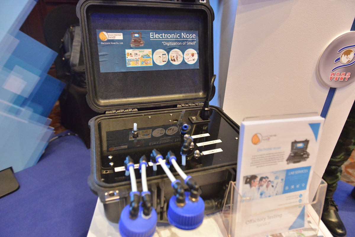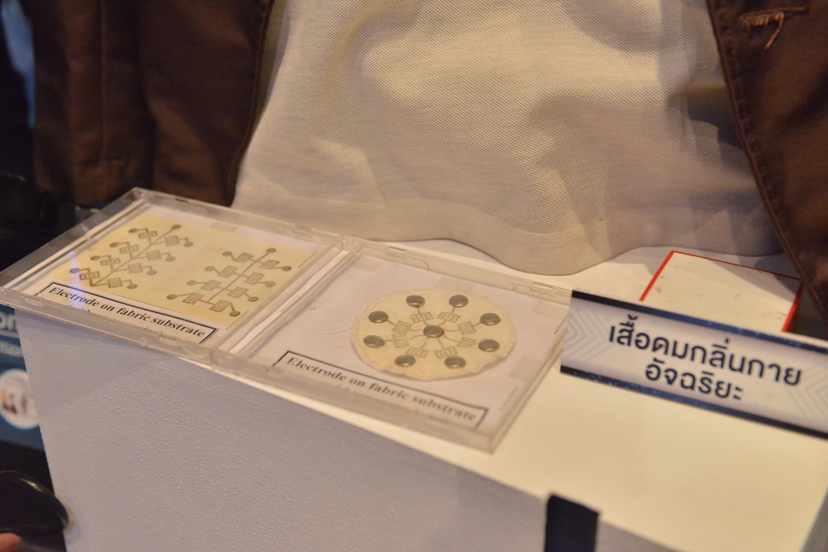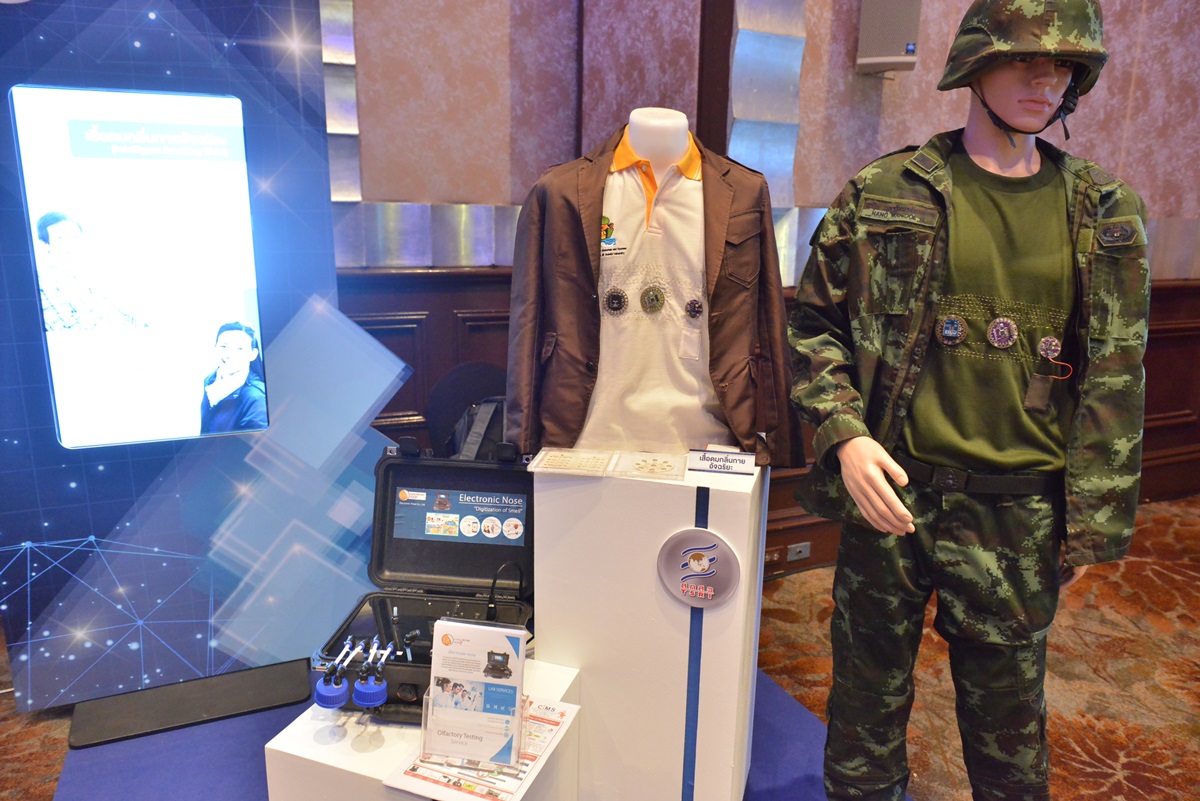 ดร.ธีรเกียรติ์ เกิดเจริญ ภาควิชาฟิสิกส์ คณะวิทยาศาสตร์ มหาวิทยาลัยมหิดล และ ดร.ธารา สีสะอาด นักวิจัยโครงการปริญญาเอกกาญจนาภิเษก คปก. เข้ารับรางวัลผลงานวิจัยเด่น สกว. ประจำปี 2561 ของสำนักงานคณะกรรมการส่งเสริมวิทยาศาสตร์ วิจัยและนวัตกรรม (สกสว.) ซึ่งจัดขึ้นที่ห้องแกรนด์ บอลรูม โรงแรมอินเตอร์คอนติเนนตัล กรุงเทพฯ สำหรับผลงาน “เสื้อดมกลิ่นกายอัจฉริยะ” ถือเป็นผลงานวิจัยด้านพาณิชย์ ทั้งนี้ พบว่าในปัจจุบันยังไม่มีเทคโนโลยีในการตรวจวัดกลิ่นกายแบบสวมใส่ได้เลย ดังนั้น ทีมวิจัยจึงต้องการพัฒนาระบบจมูกอิเล็กทรอนิกส์แบบสวมใส่ได้ สำหรับประยุกต์ใช้ในการตรวจวัดกลิ่นที่ปล่อยออกมาจากร่างกายมนุษย์เพื่อประเมินสภาวะสุขภาพ จึงเกิดแนวคิดในการพัฒนาเซนเซอร์เคมีบนผ้าสำหรับระบบจมูกอิเล็กทรอนิกส์แบบสวมใส่ได้ในรูปแบบ “เสื้อดมกลิ่นกาย” นับเป็นนวัตกรรมใหม่ โดยใช้กลิ่นที่ออกมาจากร่างกายเป็นดัชนีชี้วัดสถานะสุขภาพ เป็นวิธีการที่ไม่ก่อให้เกิดการรุกรานของโรค และจะเป็นประโยชน์ต่อการดำเนินชีวิตอย่างยิ่ง
