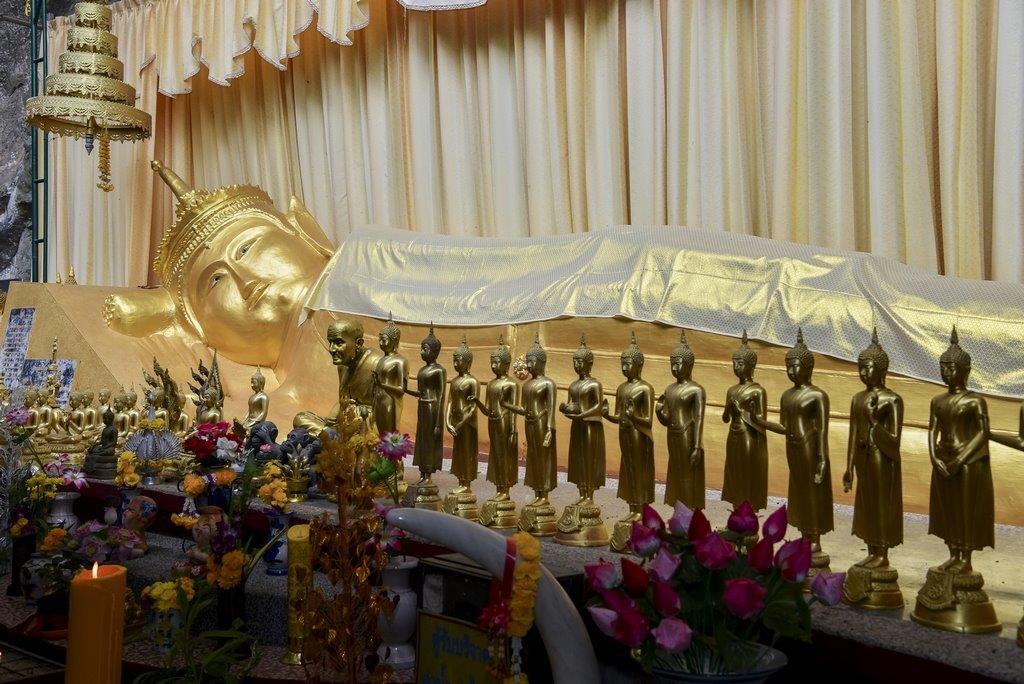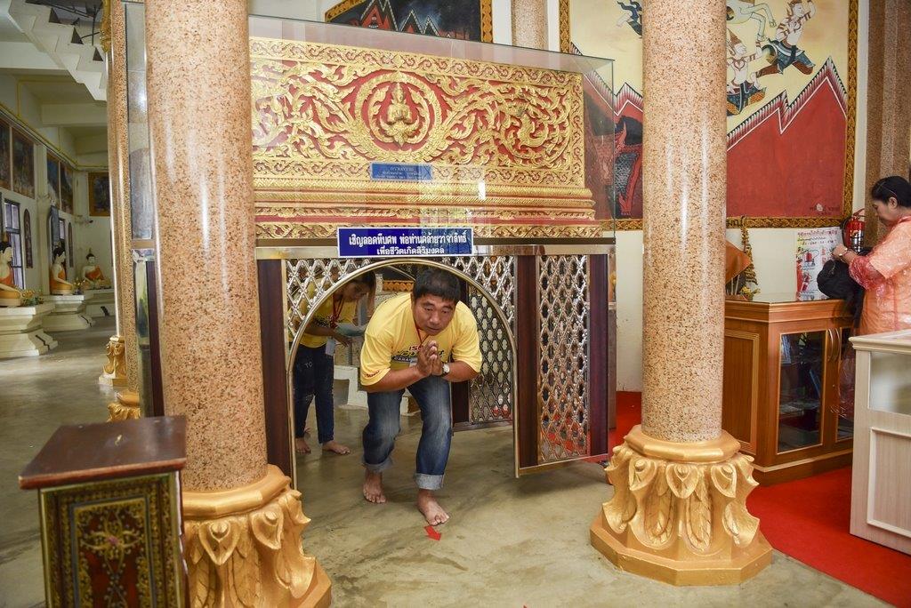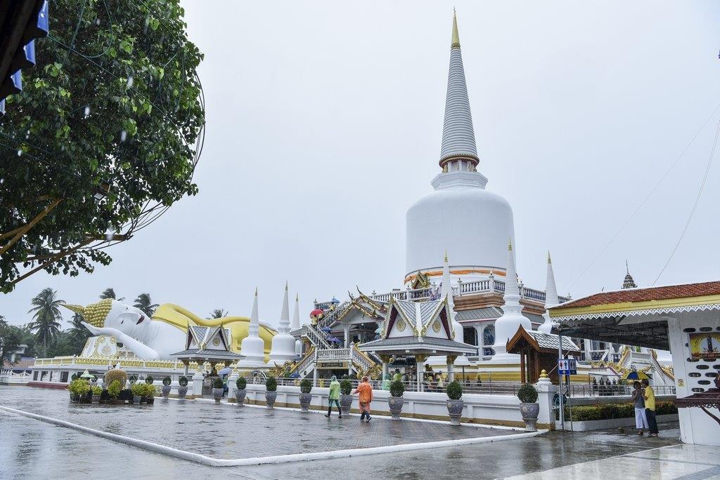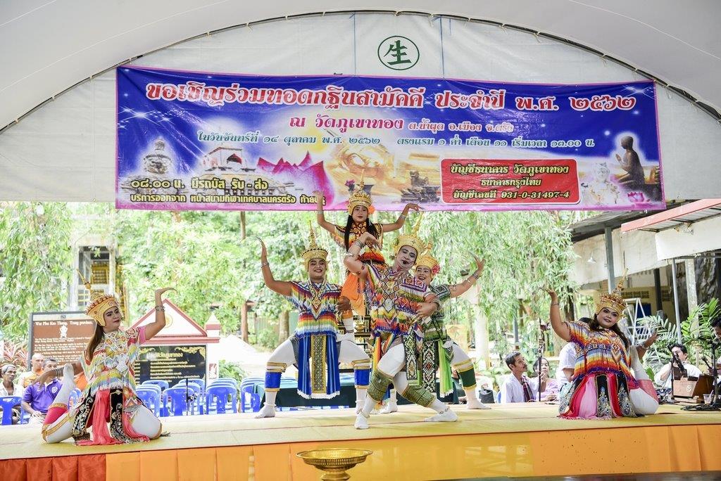 ซึ่งในวันที่ขบวนคาราวานไปถึงตรงกับวันสารทไทย ทางวัดมีการแสดงมโนราห์ จัดเต็มความอ่อนช้อย งดงาม สร้างความตื่นตาตื่นใจ พร้อมทั้งอิ่มบุญด้วยการถวายสังฆทานร่วมกัน ก่อนแยกย้ายไปสักการะและขอพรพระพุทธรูปปางปรินิพพานทรงเทริดมโนราห์ ซึ่งมีเอกลักษณ์อันโดดเด่นตรงพระเศียรทรงเทริดมโนราห์ตามศิลปะของภาคใต้ที่มีความเชื่อกันว่าเทริดนั้นเป็นเครื่องประดับที่ศักดิ์สิทธิ์และเป็นของสูง ประดิษฐานอยู่ภายในโบสถ์ที่มีแสงอาทิตย์พาดผ่านองค์พระนอนสีทองอร่ามงดงามสะดุดตา