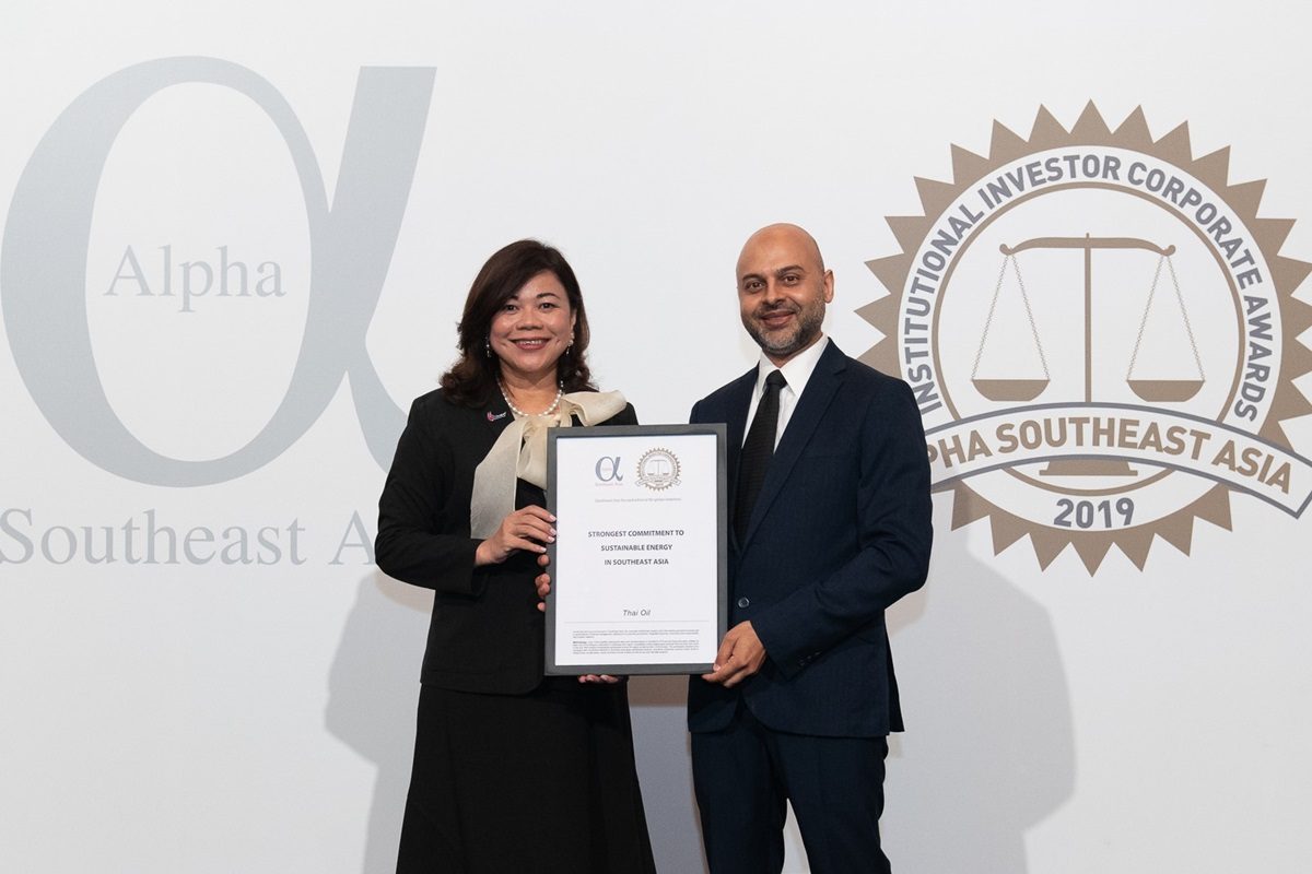 เมื่อเร็วๆ นี้ บริษัท ไทยออยล์ จำกัด (มหาชน) โดย คุณภัทรลดา สง่าแสง รองกรรมการผู้จัดการใหญ่ด้านการเงินและบัญชี รับมอบรางวัลชนะเลิศระดับภูมิภาคอาเซียน “พันธกิจสู่ความยั่งยืนด้านพลังงาน” (The Strongest Commitment to Sustainable Energy in Southeast Asia) ต่อเนื่องเป็นปีที่ 8 จาก มิสเตอร์ ซิดดิค บาซาร์วาลาร์ ซีอีโอ ของนิตยสาร Alpha Southeast Asia ซึ่งเป็นนิตยสารชั้นนำด้านการลงทุน สถาบัน การธนาคารและตลาดทุนของภูมิภาคเอเชียตะวันออกเฉียงใต้ พิธีดังกล่าวจัดขึ้น ณ ห้อง Katong Ballroom โรงแรมแชงกรีล่า ประเทศสิงค์โปร์