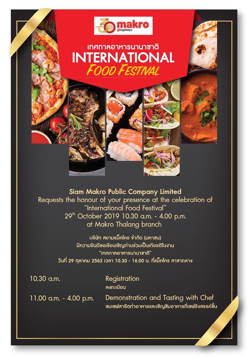29 ตุลาคมนี้แม็คโคร สาขาถลาง จังหวัดภูเก็ต จัดงานเทศกาลอาหารนานาชาติ นำเสนอวัตถุดิบ และไอเดียในการสร้างสรรค์เมนูเป็นอาหารชนชาติต่างๆ ทั้ง ญี่ปุ่น เกาหลี ตะวันตก เม็กซิกัน อินเดีย มากันครบ สมกับเป็นแหล่งรวมวัตถุดิบสำหรับธุรกิจอาหารแหล่งใหญ่ของไทย