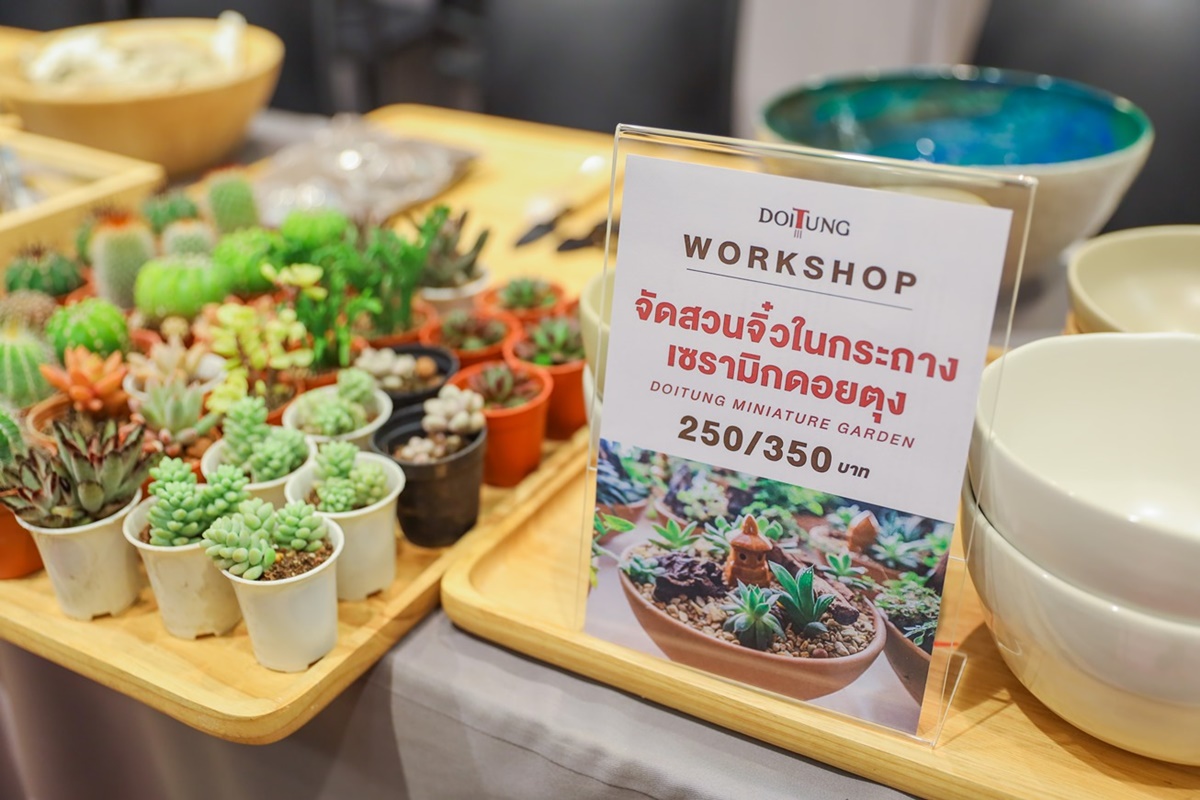 รวมไปถึงสินค้าตกแต่งบ้านอย่าง งานเซรามิก หมอน ของที่ระลึกให้เลือกอีกมากมาย และชวนร่วมเวิร์กช็อปสไตล์ดอยตุง อาทิ จัดสวนในถาด, ทำโปสการ์ดด้วยดอกไม้แห้ง, เพ้นต์เซรามิก ฯลฯ ทั้งยังมีบูธแนะนำ ดอยตุง ลอดจ์ (DaiTung Lodge) เชิญชวนให้ไปท่องเที่ยว