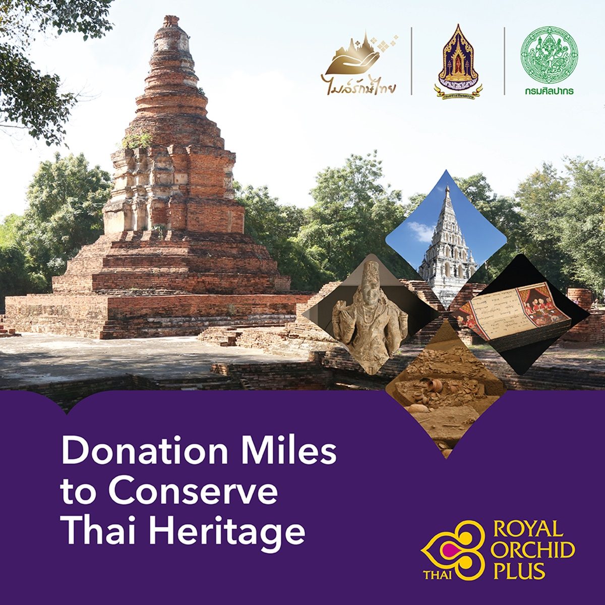 บริษัท การบินไทย จำกัด (มหาชน) ตระหนักถึงความสำคัญของคุณค่าวัฒนธรรมไทยอันเป็นมรดกของชาติ และสนับสนุนการอนุรักษ์มรดกศิลปวัฒนธรรมไทย จึงร่วมกับกรมศิลปากรและกระทรวงวัฒนธรรม เชิญชวนสมาชิก รอยัล ออร์คิด พลัส ของการบินไทย ร่วมบริจาคไมล์สะสมในโครงการไมล์รักษ์ไทย เพื่อสนับสนุนการเดินทางของ เจ้าหน้าที่กรมศิลปากร นักวิชาการ และเจ้าหน้าที่ของหน่วยงานที่เกี่ยวข้อง ในการดำเนินงานอนุรักษ์ บูรณะ และ พัฒนาแหล่งโบราณสถาน โบราณวัตถุ จดหมายเหตุ เอกสารโบราณ งานศิลปกรรม และนาฏดุริยางคศิลป์ และอื่นๆ อันเป็นมรดกทางวัฒนธรรมของชาติ ที่ตั้งอยู่ทั้งในและต่างประเทศ ให้คงอยู่เป็นแหล่งเรียนรู้และเป็นแหล่งท่องเที่ยว ทางวัฒนธรรม อีกทั้งเป็นการนำคุณค่าวัฒนธรรมสู่การเพิ่มมูลค่าทางเศรษฐกิจของประเทศ สมาชิกรอยัล ออร์คิด พลัส สามารถเลือกบริจาคไมล์สะสมตั้งแต่ 300 ไมล์ขึ้นไป โดยล็อกอินเข้าสู่ระบบบัญชีสมาชิกผ่านทางเว็บไซต์ รอยัล ออร์คิด พลัส ที่ thaiairways.com/rop จากนั้นเลือก ‘บริการอื่นๆ’ และ คลิก ‘บริจาคไมล์สะสม’ สมาชิกสามารถบริจาคไมล์สะสมได้ตั้งแต่วันนี้ ถึง 31 พฤษภาคม 2563