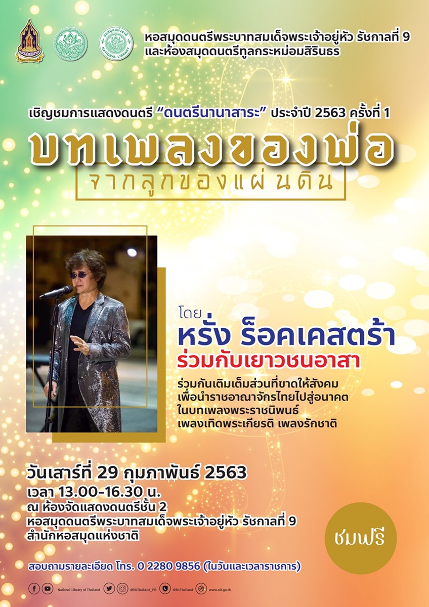 กรมศิลปากร กระทรวงวัฒนธรรม โดยสำนักหอสมุดแห่งชาติ หอสมุดดนตรีพระบาทสมเด็จพระเจ้าอยู่หัว รัชกาลที่ ๙ และห้องสมุดดนตรีทูลกระหม่อนสิรินธร กำหนดจัดโครงการดนตรีนานาสาระ ประจำปี ๒๕๖๓ ครั้งที่ ๑ เรื่อง “บทเพลงของพ่อจากลูกของแผ่นดิน” โดยหรั่ง ร๊อคเคสตร้าและเยาวชนอาสา ในวันเสาร์ที่ ๒๙ กุมภาพันธ์ ๒๕๖๓ เวลา ๑๓.๐๐ – ๑๖.๓๐ น. ณ ห้องจัดแสดง ชั้น ๒ หอสมุดดนตรีพระบาทสมเด็จพระเจ้าอยู่หัว รัชกาลที่ ๙ และห้องสมุดดนตรีทูลกระหม่อนสิรินธร สำนักหอสมุดแห่งชาติ