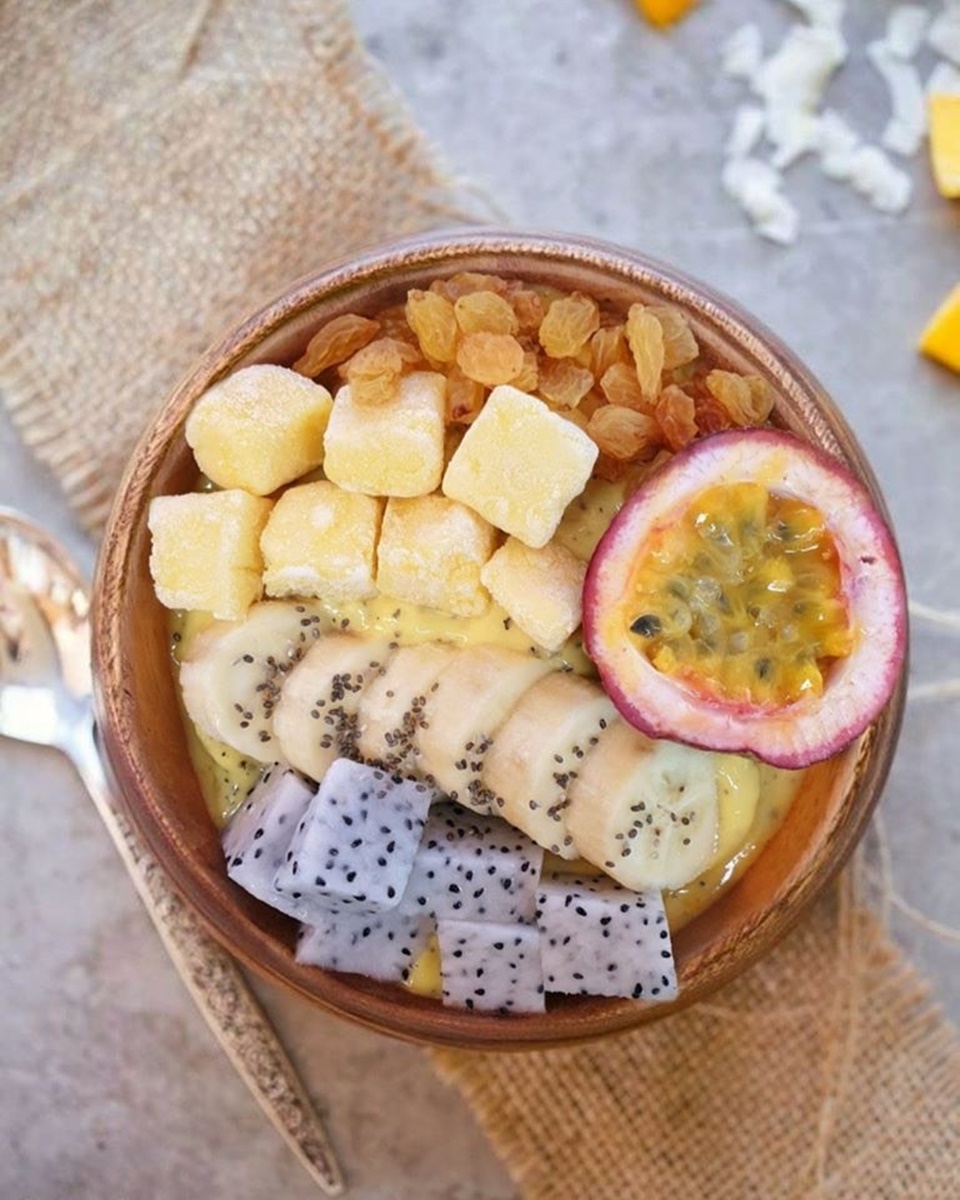 - “Passionfruit mango smoothie.” สมูตตี้โบว์ลสีสันสดใสด้วยผลไม้สารพัดประโยชน์ทั้ง มะม่วง, เสาวรส เป็นต้น
