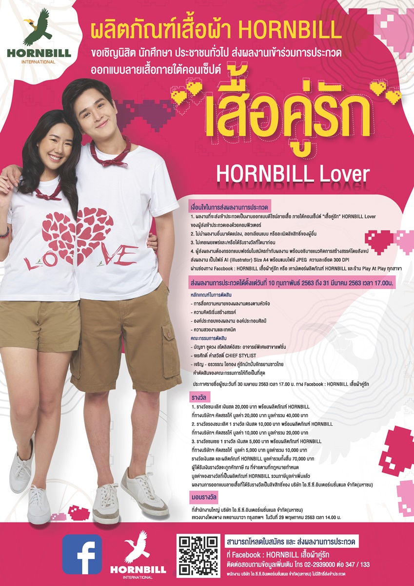 ผลิตภัณฑ์เครื่องแต่งกายคู่รัก HORNBILL เปิดโครงการประกวดออกแบบลวดลาย “เสื้อคู่รัก” (HORNBILL LOVER) ให้ประชาชนทั่วไป นิสิต นักศึกษา ได้ร่วมสร้างสรรค์ผลงาน ที่สะท้อนถึงความรักแท้ ผ่านลวดลายเสื้อ โดยมีคณะกรรมการร่วมการตัดสิน ได้แก่ บัญชา ชูดวง สไตลิสต์อิสระและอาจารย์พิเศษสาขาแฟชั่น, จเรศักดิ์ คำสวัสดิ์ CHIEF STYLIST แบรนด์ HORNBILL, เจริญ – อรวรรณ โอทอง คู่รักนักปั่นจักรยานชาวไทย