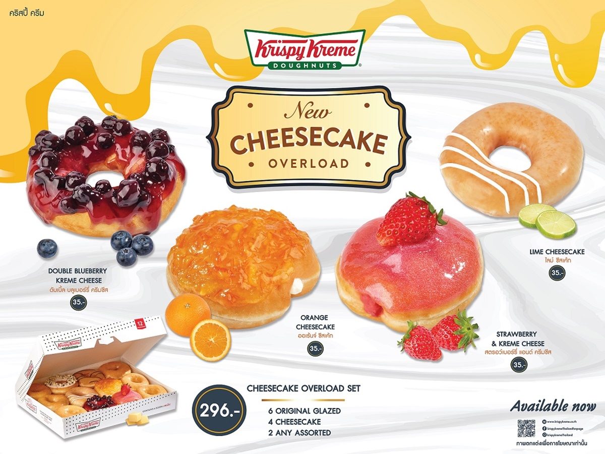 อร่อยไปกับความเย้ายวนใจแบบพรีเมี่ยมของ 4 รสชาติใหม่ “นิว ชีสเค้ก โอเวอร์โหลด โดนัท” (New Cheesecake Overload Doughnut) ได้ตั้งแต่วันที่ 9 มีนาคม – 5 เมษายน 2563 ณ ร้าน คริสปี้ ครีม ทั้ง 39 สาขา ใกล้บ้านคุณ ในราคาเพียงชิ้นละ 35 บาท หรือแบบเซ็ต ในราคา 296 บาท (ราคาดังกล่าว ยกเว้นสาขาสนามบินสุวรรณภูมิ และสนามบินดอนเมือง)
