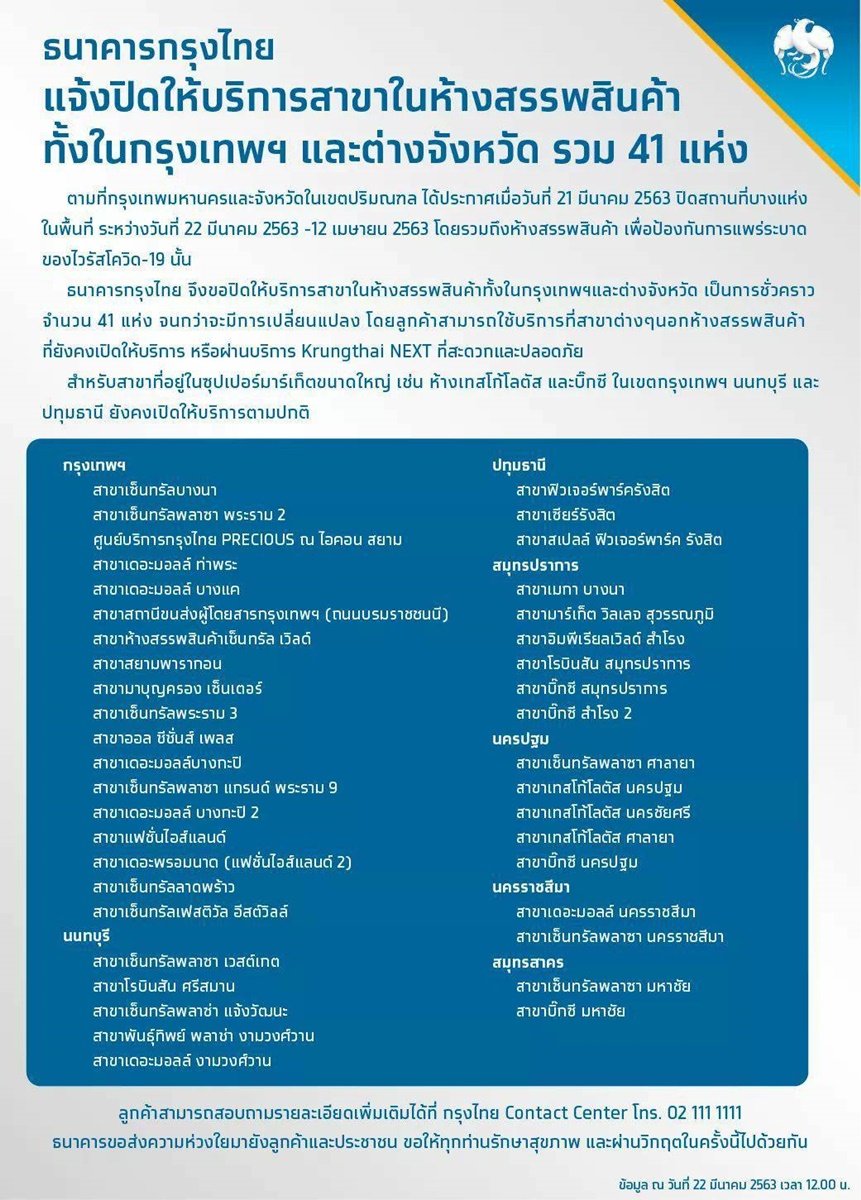 ธนาคารกรุงไทย จึงขอปิดให้บริการสาขาในห้างสรรพสินค้าทั้งในกรุงเทพฯ ปริมณฑล และจังหวัดนครราชสีมาเป็นการชั่วคราว จำนวน 41 แห่ง จนกว่าจะมีการเปลี่ยนแปลง โดยลูกค้าสามารถใช้บริการที่สาขาต่างๆนอกห้างสรรพสินค้าที่ยังคงเปิดให้บริการ หรือผ่านบริการ Krungthai NEXT ที่สะดวกและปลอดภัย