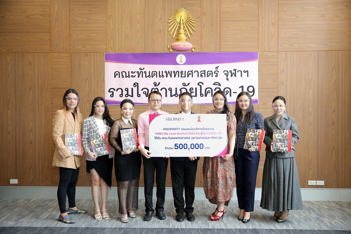 ปรียามล ธนวิสุทธิ์ (ที่ 4 จากขวา) ผู้บริหาร ไฮโซปาร์ตี้ มอบเงินบริจาคโครงการ “HISO We Love ส่งมอบกำลังใจร่วมสู้ภัย COVID-19” เนื่องในโอกาสครบรอบ 17 ปี ไฮโซปาร์ตี้ จำนวน 500,000 บาท ให้กับ ผศ.ทพ.ดร.สุชิต พูลทอง (คนกลาง) คณบดีคณะทันตแพทยศาสตร์ จุฬาลงกรณ์มหาวิทยาลัย เพื่อสมทบทุนซื้อเครื่อง EOS (External oral suction) เครื่องดูดละอองฝอยที่เกิดขึ้นระหว่างการทำงานทางทันตกรรม โดยมี รศ.ทพ.เฉลิมพล ลี้ไวโรจน์ (ที่ 4 จากซ้าย), สุริยน ศรีอรทัยกุล (ที่ 3 จากซ้าย) และ วารีนิธิ กันท์ไพบูลย์ (ขวาสุด) ร่วมเป็นสักขีพยาน ณ ห้อง รฤกคุณ ชั้น 2 อาคารบรมนาถศรีนครินทร์ คณะทันตแพทยศาสตร์ จุฬาลงกรณ์มหาวิทยาลัย เมื่อวันก่อน