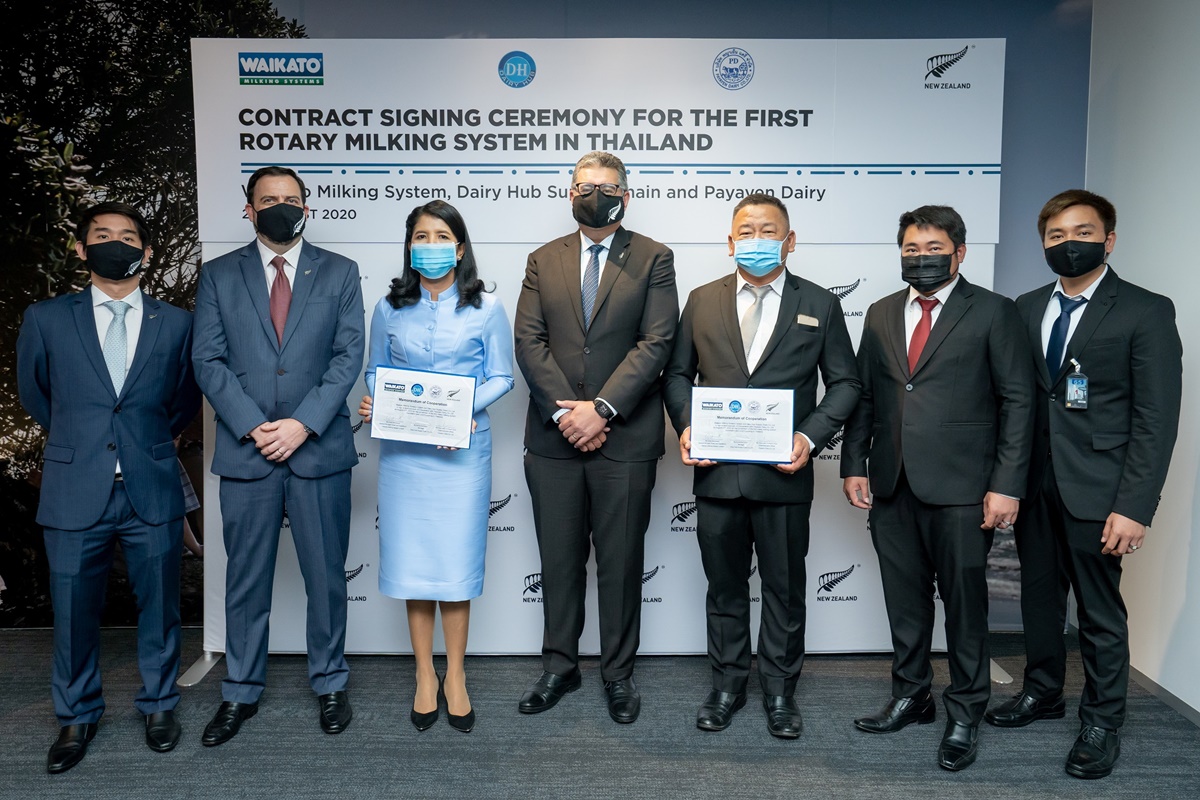 ข้อตกลงระหว่างบริษัทพญาเย็น แดรี่ บริษัทไวกาโต้ มิลค์กิ้ง ซิสเตมส์ และผู้จัดจำหน่าย บริษัทแดรี่ ฮับ ซับพลาย เชน ในการจัดซื้อระบบรีดนมอัตโนมัติแบบหมุน ระบบแรกในประเทศไทย จัดขึ้นอย่างเป็นทางการในวันนี้ ณ สถานทูตนิวซีแลนด์ประจำประเทศไทย กรุงเทพมหานคร โดยผู้มีเกียรติที่ร่วมงานประกอบด้วย ฯพณฯ ทาฮา แมคเฟอร์สัน เอกอัครราชทูตนิวซีแลนด์ประจำประเทศไทย นายไรอัน เฟรียร์ ทูตพาณิชย์นิวซีแลนด์ประจำประเทศไทย นายแกรนท์ วิสนิวสกี้ จากไวกาโต้ มิลค์กิ้ง ซิสเตมส์ นางสาวสุนันทา สุดศิริ จากบริษัทแดรี่ ฮับ ซับพลาย เชน จำกัด และนายชนะศักดิ์ จุมพลอานันท์ ประธานเจ้าหน้าที่บริหาร บริษัทพญาเย็น แดรี่
