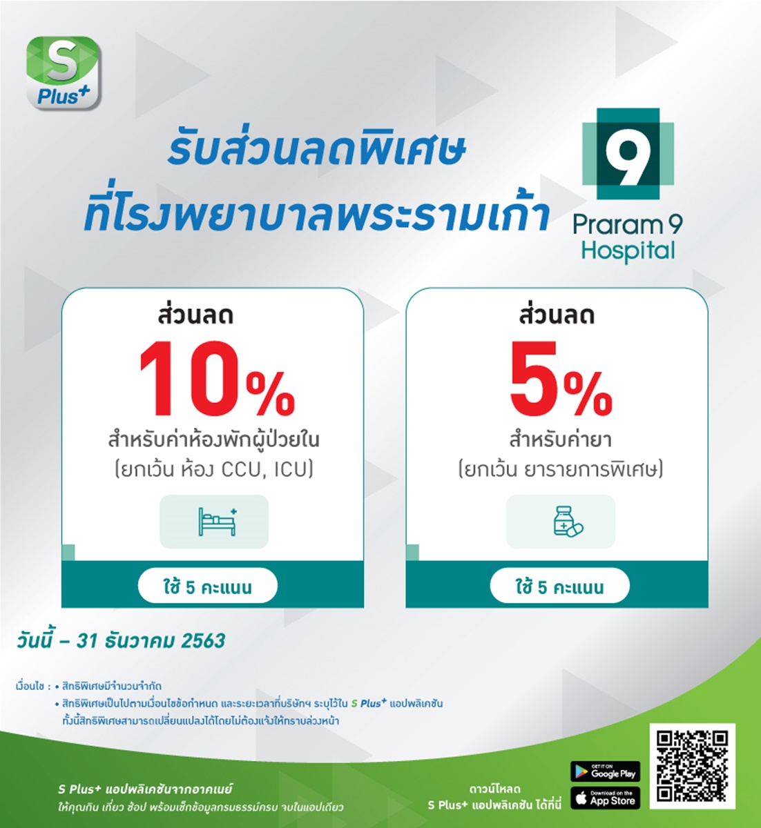 S Plus+ แอปพลิเคชัน โดย อาคเนย์ กลุ่มธุรกิจประกันและการเงิน ห่วงใยสมาชิก จับมือ โรงพยาบาลพระรามเก้า มอบส่วนลดพิเศษ 10% สำหรับห้องพักผู้ป่วยใน (ยกเว้นห้อง CCU, ICU) โดยสมาชิก S PLUS+ ใช้ 5 คะแนนเพื่อแลกรับสิทธิ์ และใช้ 5 คะแนน แลกรับส่วนลด 5% สำหรับค่ายา (ยกเว้นยารายการพิเศษ) ตั้งแต่วันนี้ – 31 ธ.ค. 63