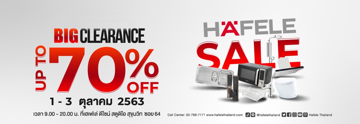 งานดีเพื่อคนรักบ้าน!! เฮเฟเล่ ผู้นำนวัตกรรมอุปกรณ์ฮาร์ดแวร์ อุปกรณ์เฟอร์นิเจอร์ เครื่องใช้ไฟฟ้าในครัว อุปกรณ์ล็อคอิเล็คทรอนิกส์ อุปกรณ์ไฟแสงสว่าง พร้อมทั้งอุปกรณ์สุขภัณฑ์มาตรฐานจากประเทศเยอรมนี จัดหนักจัดเต็มมหกรรมสุดปัง ลดราคาสุดยิ่งใหญ่แห่งปี 2020 ในงาน “HÄFELE Big Clearance Sale 2020” พบกับสินค้าและของตกแต่งบ้านคุณภาพจากเยอรมนี ยกขบวนมาให้ช้อปในราคาสุดพิเศษ ครั้งเดียวในรอบปี หมดแล้วหมดเลย ลดสูงสุดถึง 70%!!