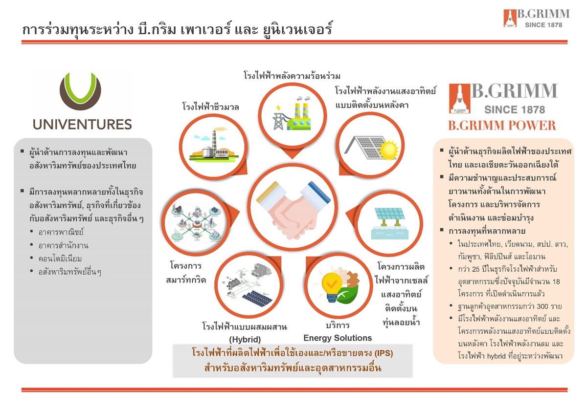 นายกำพล ปุญโสณี กรรมการผู้จัดการใหญ่ บริษัท ยูนิเวนเจอร์ จำกัด (มหาชน) หรือ UV กล่าวเสริมว่า ในการผนึกกำลังครั้งสำคัญกับ BGRIM ซึ่งถือเป็นผู้ผลิตไฟฟ้าเอกชนรายใหญ่ระดับเอเชียตะวันออกเฉียงใต้ จะเป็นการพัฒนาต่อยอดความเชี่ยวชาญของทั้ง 2 กลุ่มธุรกิจ เพื่อการเติบโตอย่างยั่งยืนในอนาคต