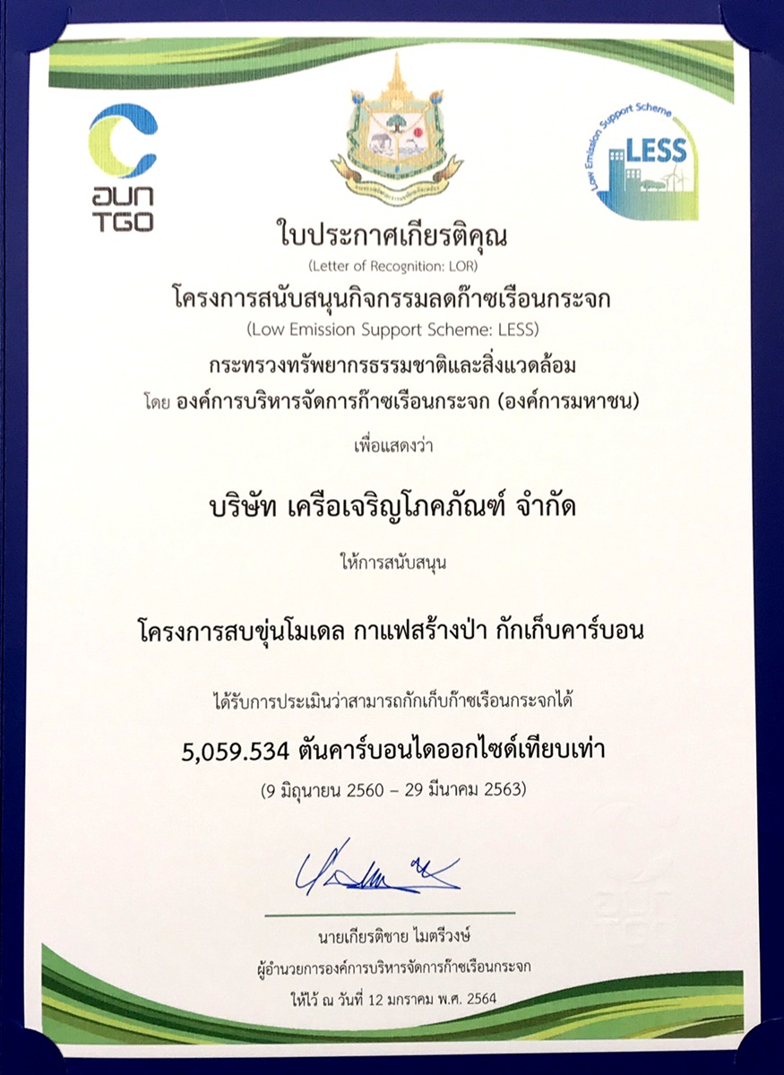 เครือเจริญโภคภัณฑ์ คว้าประกาศเกียรติคุณโครงการสนับสนุนกิจกรรมลดก๊าซเรือนกระจก หรือ LESS จากการส่งเสริมโครงการสบขุ่นโมเดล กาแฟสร้างป่า กักเก็บก๊าซคาร์บอนไดออกไซด์ ช่วยโลกลดภาวะโลกร้อน ช่วยให้ชุมชนมีส่วนร่วมสร้างสมดุลระหว่างมนุษย์ ธรรมชาติและสิ่งแวดล้อม พร้อมมีอาชีพที่ยั่งยืน