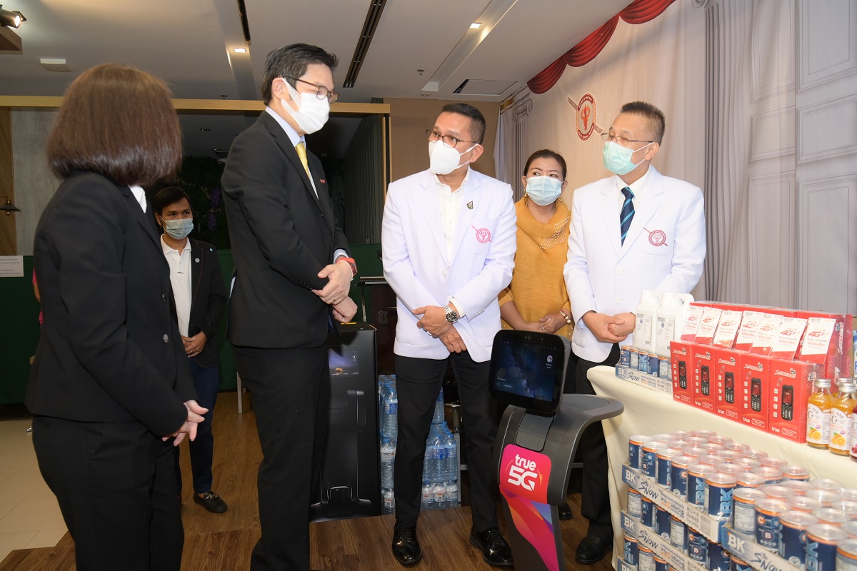 นายมนัสส์  มานะวุฒิเวช  กรรมการผู้จัดการใหญ่ (ร่วม) บมจ. ทรู คอร์ปอเรชั่น กล่าวว่า กลุ่มทรู เร่งนำศักยภาพโครงสร้างพื้นฐานโทรคมนาคมดิจิทัลและนวัตกรรมเทคโนโลยี อำนวยความสะดวกให้แก่แพทย์ พยาบาล เจ้าหน้าที่ และผู้ป่วยติดเชื้อโควิด-19 ให้ติดต่อสื่อสารกันได้อย่างราบรื่น  ไม่สะดุด โดยจัดส่งหุ่นยนต์อัจฉริยะ True 5Gเทมิ” ช่วยดูแลผู้ป่วยได้จากระยะไกล ทั้งติดตามอาการและให้คำแนะนำในการรักษา ลดการสัมผัสและความเสี่ยงติดเชื้อ ทำให้สามารถดูแลคนไข้ได้อย่างทั่วถึงมากยิ่งขึ้น รวมถึงติดตั้งไฟเบอร์อินเทอร์เน็ต และตัวกระจายสัญญาณ WiFi ภายในอาคาร ตลอดจนมอบ True SMART 4G Adventure (Walkie Talkie) พร้อมซิมทรูมูฟ เอชแบบเติมเงิน ให้บุคลากรทางการแพทย์ใช้โทรและดาต้าฟรี นานปี และเพิ่มความผ่อนคลายด้วยบริการ “ทรูวิชั่นส์ นาว” (TrueVisions NOW) รับชม 24 ช่องดังจากทรูวิชั่นส์ได้ทันทีผ่านสมาร์ทโฟน บนแอปพลิเคชันทรูไอดี โดยมอบรหัสดูฟรีให้ผู้ป่วย นอกจากนี้ ยังเปิดคอลล์ เซ็นเตอร์เฉพาะกิจ 02-700-9022 เพื่อดูแลเครือข่ายและบริการในโรงพยาบาลอย่างใกล้ชิด ตอกย้ำความมุ่งมั่นของกลุ่มทรู ที่ต้องการเคียงคู่คนไทยและประเทศไทย ให้ก้าวข้ามวิกฤตโควิด-19 ไปด้วยกัน