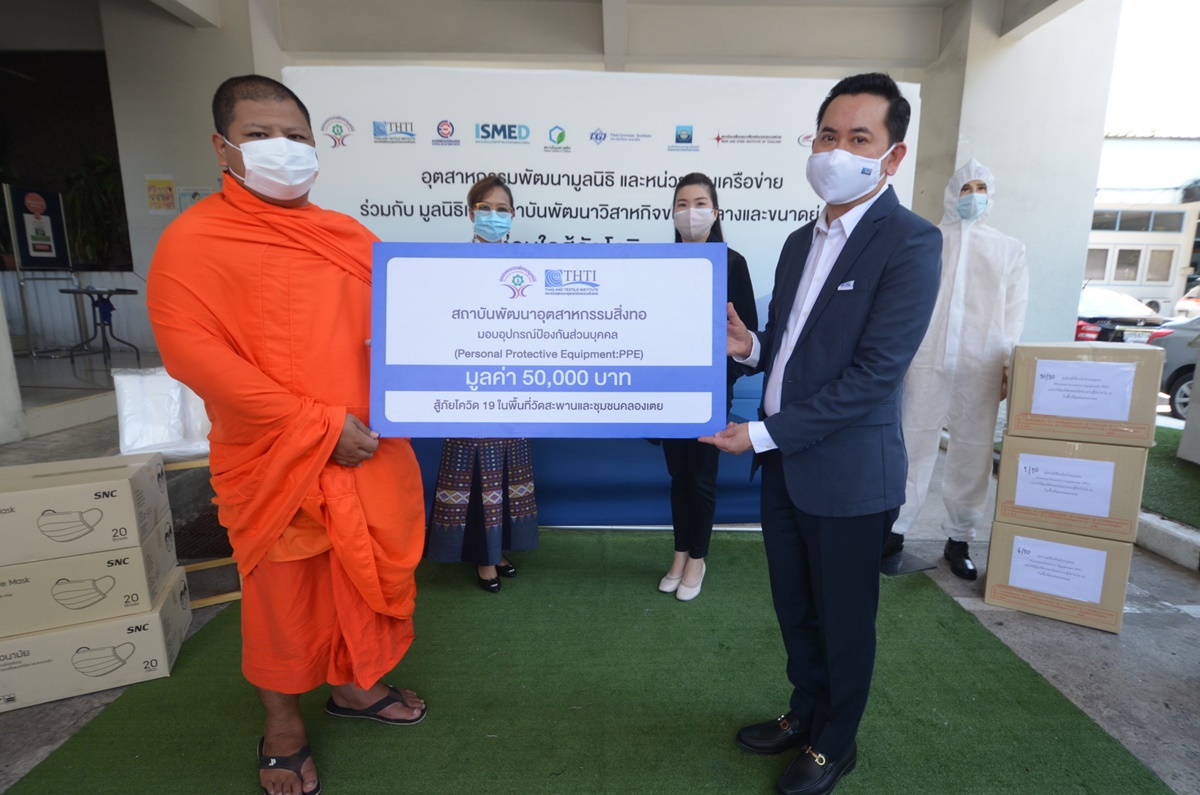 นายปราโมทย์ วิทยาสุข ประธานกรรมการสถาบันพัฒนาอุตสาหกรรมสิ่งทอ มอบหมายให้ นายชาญชัย สิริเกษมเลิศ ผู้อำนวยการสถาบันพัฒนาอุตสาหกรรมสิ่งทอ เป็นตัวแทนส่งมอบอุปกรณ์ป้องกันส่วนบุคคล (Personal Protective Equipment : PPE) ใช้ครั้งเดียวทิ้ง มูลค่ารวม 50,000 บาทเพื่อสนับสนุนการดำเนินงานช่วยเหลือสถานการณ์โควิด-19 แก่เจ้าหน้าที่ ประชาชน ในศูนย์พักคอยวัดสะพาน ในพื้นที่ชุมชนคลองเตย โดยมี พระกุลชาติ กุลชาโต ผู้ช่วยท่านเจ้าอาวาส วัดสะพานพระโขนง เป็นผู้รับมอบ ณ สถาบันพัฒนาอุตสาหกรรมสิ่งทอ