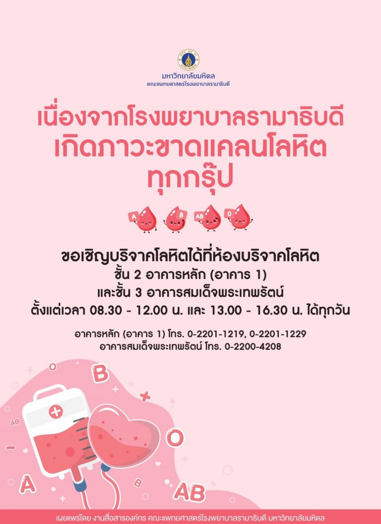 รพ.รามาธิบดีขาดแคลนโลหิต เชิญชวนร่วมบริจาค ประชาสัมพันธ์ FacebookFacebookXTwitterLINELine บริจาคโลหิต – คณะแพทยศาสตร์ โรงพยาบาลรามาธิบดี ขอเชิญชวนบริจาคโลหิต เนื่องจากโรงพยาบาลรามาธิบดีเกิดภาวะขาดแคลนโลหิตทุกกรุ๊ป สามารถบริจาคโลหิตได้ที่ห้องบริจาคโลหิต ชั้น 2 อาคารหลัก (อาคาร1) และชั้น 3 อาคารสมเด็จพระเทพรัตน์ ตั้งแต่เวลา 08.30 – 12.00 น. และ เวลา 13.00 -16.30 น. ได้ทุกวัน อาคารหลัก (อาคาร 1) โทร.0-2201-1219, 0-2201-1229 อาคารสมเด็จพระเทพรัตน์ โทร. 0-2200-4208 FacebookFacebookXTwitterLINELine