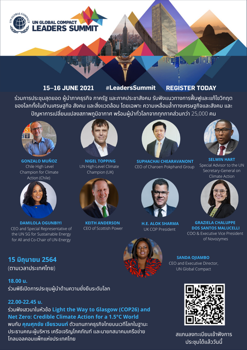 สำหรับการประชุม UN Global Compact Leaders Summit 2021 จัดขึ้นระหว่างวันที่ 15-16 มิถุนายน ในรูปแบบการประชุมเสมือนจริงผ่านทางออนไลน์ที่เปิดให้ผู้นำภาคส่วนต่าง ๆ และผู้สนใจจากทั่วโลกสามารถเข้าร่วมงานได้ตลอด 24 ชั่วโมง ซึ่งเป็นการประชุมมาราธอนยาวตลอด 2 วัน โดยได้รับเกียรติจาก นายอันโตนิโอ กูแทเรส (António Guterres) เลขาธิการองค์การสหประชาชาติ และนางสาวซานด้า โอเจียมโบ (Sanda Ojiambo) ซีอีโอและผู้อำนวยการบริหาร UN Global Compact กล่าวเปิดงานประชุมอย่างเป็นทางการ ซึ่งไฮไลท์การประชุมนี้จะเป็นเวทีที่ได้นำวิสัยทัศน์และกลยุทธ์จากบรรดาสุดยอดผู้นำจากทั่วโลก มาร่วมสร้างแนวทางองค์กรแห่งความยั่งยืนด้วยการแลกเปลี่ยนประสบการณ์ต่าง ๆ ที่จะนำไปสู่การลงมือปฏิบัติได้จริงเพื่อสร้างโลกที่น่าอยู่ขึ้น โดยมีทั้งผู้บริหารจากภาครัฐ นายกเทศมนตรี ซีอีโอและผู้บริหารจากภาคธุรกิจชั้นนำในหลายประเทศทั่วโลกร่วมการประชุม อาทิ เครือเจริญโภคภัณฑ์, ยูนิลีเวอร์, ชไนเดอร์ อิเล็คทริค, ลอรีอัล, เนสท์เล่, หัวเว่ย, อิเกีย, ซีเมนส์ เอจี ตลอดจนผู้บริหารจากบริษัทที่ปรึกษา บอสตัน คอนซัลท์ติ้ง กรุ๊ป , ผู้บริหารจากบริษัทกฎหมาย และการจัดการทางธุรกิจระดับโลก เบเคอร์ แอนด์ แม็คเคนซี่ นอกจากนี้ยังมีนักลงทุน นักกิจกรรม องค์กรธุรกิจเพื่อสังคม ผู้เชี่ยวชาญจากองค์กรด้านความยั่งยืน นักวิชาการ และสื่อมวลชนชั้นนำ เข้าร่วมประชุมระดมความคิดเห็นเพื่อรับมือกับวิกฤตการณ์การเปลี่ยนแปลงทางสภาพภูมิอากาศที่มาบรรจบกับการระบาดของโควิด-19