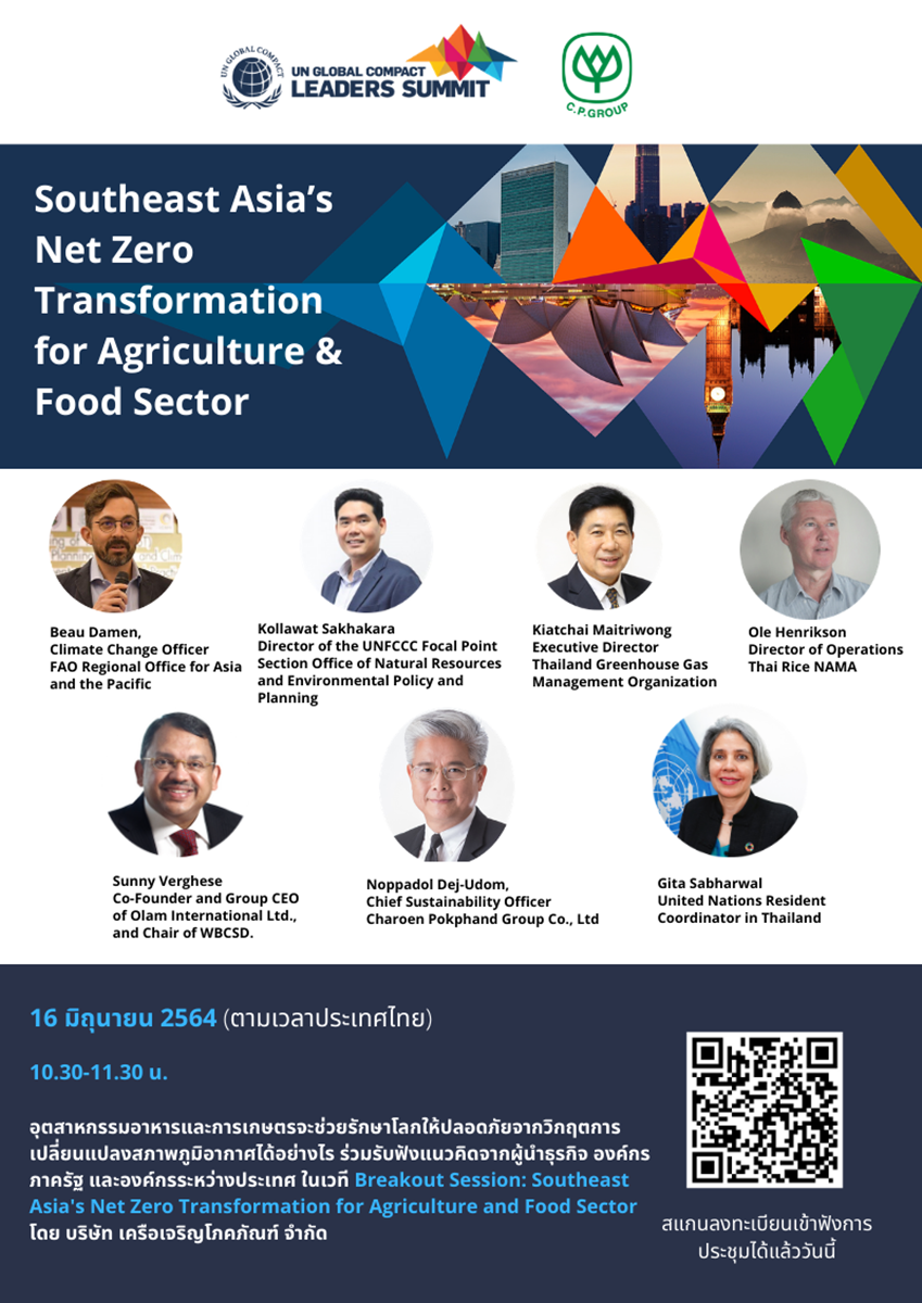 การประชุมสุดยอดผู้นำระดับโลกด้านความยั่งยืน ประจำปี 2564 ที่จัดขึ้นในครั้งนี้ถือเป็นวาระสำคัญของประเทศไทยที่ได้มีบทบาทและเจตจำนงในการลดโลกร้อน โดยประเทศไทยได้รับเกียรติเป็นเจ้าภาพจัดงานเสวนาบนการประชุมสุดยอดผู้นำระดับโลกด้านความยั่งยืน ประจำปี 2564 ถึง 2 หัวข้อด้วยกัน หัวข้อแรก คือ “การขับเคลื่อนอุตสาหกรรมเกษตรและอาหารในภูมิภาคเอเชียตะวันออกเฉียงใต้สู่การปล่อยยคาร์บอนสุทธิเป็นศูนย์” หรือ “Southeast Asia’s Net Zero Transformation for Agriculture & Food Sector” จัดโดย เครือเจริญโภคภัณฑ์จากประเทศไทย มีผู้ร่วมเสวนาจากประเทศไทย ได้แก่ นายนพปฎล เดชอุดม ประธานคณะผู้บริหารด้านความยั่งยืนองค์กร เครือเจริญโภคภัณฑ์ ดร.กลย์วัฒน์ สาขากร (Kollawat Sakhakara) ผู้อำนวยการกลุ่มงานประสานงานกลางอนุสัญญา สำนักงานนโยบายและแผนทรัพยากรธรรมชาติและสิ่งแวดล้อม (สผ.) นายเกียรติชาย ไมตรีวงษ์ (Kiatchai Maitriwong) ผู้อำนวยการองค์การบริหารจัดการก๊าซเรือนกระจก (องค์การมหาชน) จัดขึ้นในวันที่ 16 มิถุนายน 2564 เวลา 10.30-11.30 น. (ตามเวลาประเทศไทย)