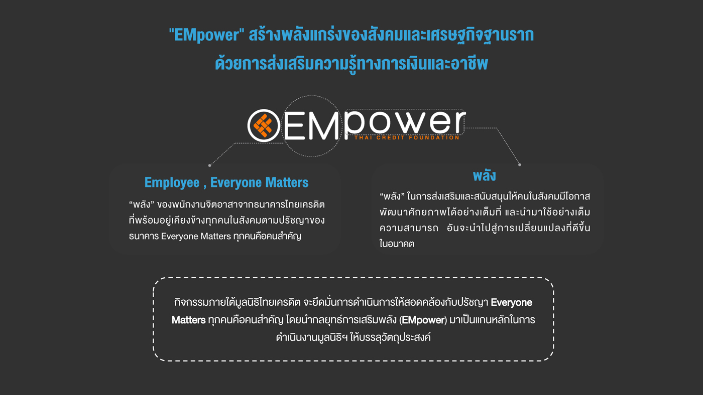 ธนาคารไทยเครดิต เพื่อรายย่อย จำกัด (มหาชน) เปิดตัวมูลนิธิไทยเครดิต ภายใต้แนวคิดหลัก EMpower เสริมพลังแกร่งสู่สังคม ขยายบทบาทการดำเนินกิจกรรมเพื่อสังคมในทุกมิติ ด้วยวิสัยทัศน์ ที่มุ่งพัฒนา ส่งเสริมสังคมและเศรษฐกิจแก่ผู้ประกอบการรายย่อย ผู้ด้อยโอกาส เพื่อความเป็นอยู่ที่ดีขึ้นของสังคมไทย เพราะเชื่อมั่นว่า การสร้างความตระหนักรู้ และวินัยทางด้านการเงิน จะเป็นพื้นฐานสำคัญในการพัฒนาชีวิต พัฒนาธุรกิจ และชุมชนให้มั่นคงอย่างยั่งยืน ซึ่งจะช่วยลดปัญหาหนี้ครัวเรือนที่เป็นปัญหาใหญ่ระดับประเทศ โดยตั้งเป้าในปี 2566 จะมีผู้เข้าอบรมไม่ต่ำกว่า 50,000 ราย แบ่งเป็นผู้ประกอบการรายย่อย 55% และบุคคลอาชีพอื่น ๆ รวมถึงเยาวชน และ ผู้ด้อยโอกาส อีก 45%