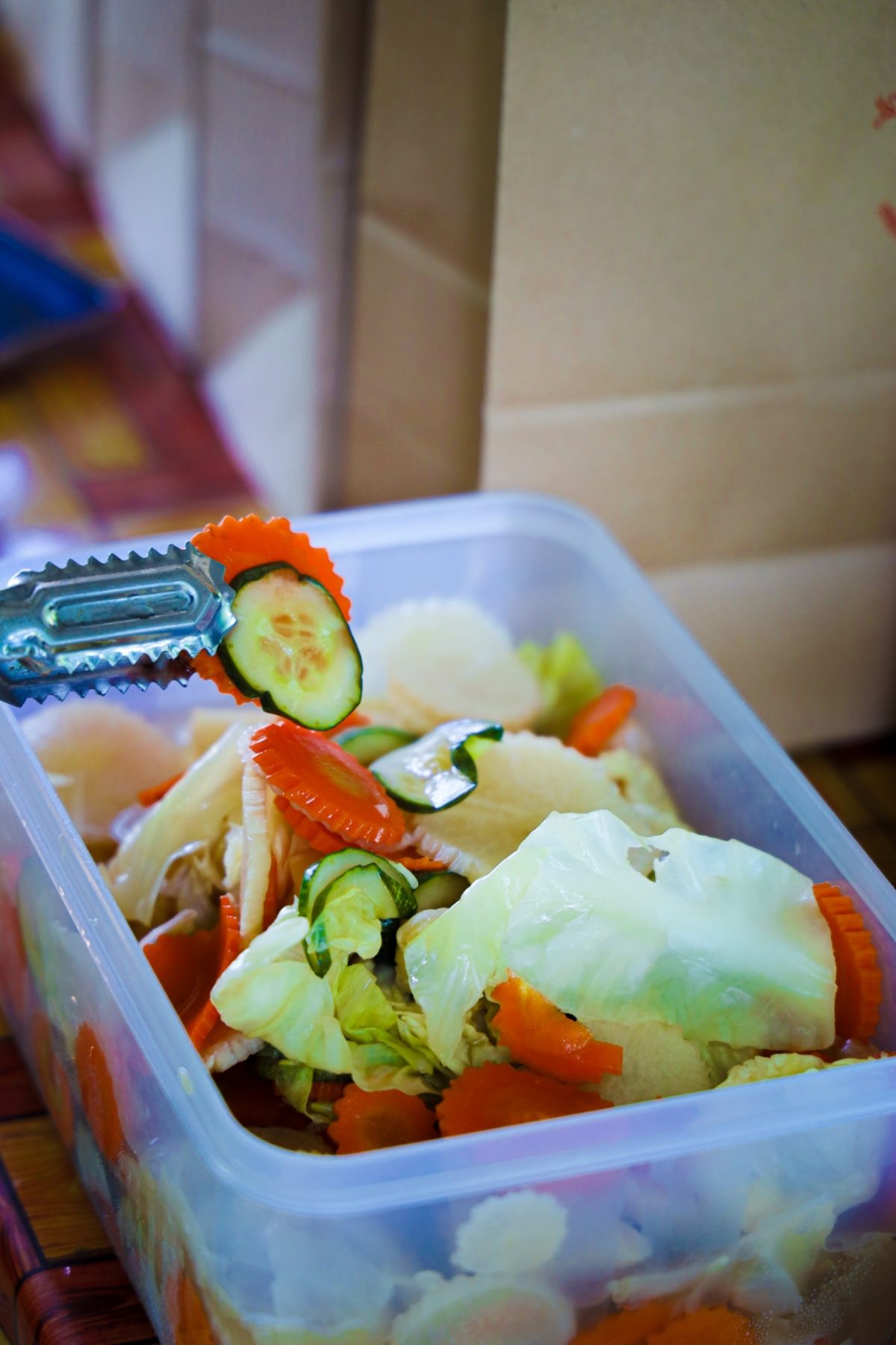 นอกเรื่องไปพักใหญ่ ขอกลับมาต่อที่ขั้นตอนทอดขาหมูกันบ้าง หลังทิ้งให้เย็นแล้ว ตั้งเตาให้ร้อนและนำขาหมูลงไปทอดด้วยน้ำมันปาล์มจนเหลืองกรอบ พักให้สะเด็ดน้ำมัน ระหว่างนั้นเชฟโชว์ทีเด็ดนำ ผักดอง ที่ใช้ผักสดดองกับน้ำส้มสายชูหมักสูตรพิเศษ รสเปรี้ยวอมหวาน คล้ายรสชาติของผลไม้ดองจิ้มพริกเกลือ ขนาดคนไม่กินผักยังกินเพลิน แถมออกปากว่าอร่อย 10 เต็ม 10 กินกับขาหมูตัดเลี่ยนได้เป็นอย่างดี สำหรับน้ำจิ้มมีให้ชิม 2 รส 2 สไตล์ ได้แก่ น้ำจิ้มดำแบบหวาน และพริกน้ำส้มหอมเผ็ดเปรี้ยวกำลังดี