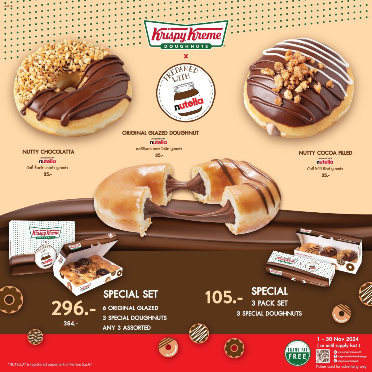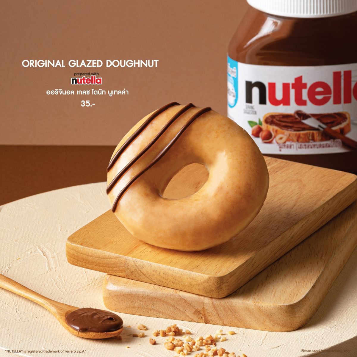 คริสปี้ ครีม  (Krispy Kreme) โดนัทสูตรลิขสิทธิ์อันดับ 1 ที่ครองใจคนทั่วโลก ชวนคุณมาสัมผัสประสบการณ์ใหม่ ด้วยคอลเล็กชัน Krispy Kreme x prepared with nutella นำรสชาติความอร่อยระดับตำนานแบบฉบับของนูเทลล่ามารังสรรค์ เป็น 3 หน้าสุดพิเศษ เริ่มด้วย “ออริจินอล เกลซ โดนัท นูเทลล่า” (Original Glazed Doughnut prepared with nutella) เมนูยอดฮิตอย่างออริจินอล เกลซ สอดไส้นูเทลล่าเข้มเต็มวง, “นัทตี้ ช็อกโกแลตต้า นูเทลล่า” (Nutty Chocolatta prepared with nutella) โดนัทเคลือบนูเทลล่าเน้นๆ พร้อมโรยพีนัท ครัช เพิ่มความกรุบกรอบ, “นัทตี้ โกโก้ ฟิลด์ นูเทลล่า” (Nutty Cocoa Filled prepared with nutella) โดนัทเนื้อนุ่มสอดไส้นูเทลล่าครีม ท็อปด้วยนูเทลล่า-ไวท์ช็อกโกแลต และพราลีน แคชชูว เพิ่มความอร่อยในทุกคำ