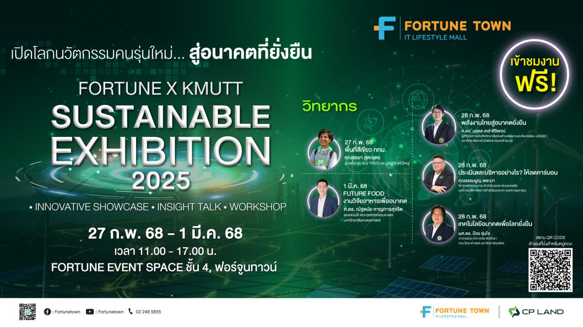 ฟอร์จูนทาวน์ จับมือกับ สถาบันเทคโนโลยีพระจอมเกล้าธนบุรี จัดงาน “Fortune x KMUTT Sustainable Exhibition 2025” ภายในงานชม Innovative Showcase ให้ความรู้เกี่ยวกับนวัตกรรม พลังงานสะอาด นวัตกรรมสีเขียว (Green Technology) อาทิ พลังงานทางเลือกจากจุลินทรีย์และชีวมวล พลาสติกย่อยสลายได้ Insight talk กับวิทยากร ผู้เชี่ยวชาญด้านต่างๆ ตลอด 3 วันเต็ม อาทิ “การเติบโตของพลังงานไทยเพื่อความยั่งยืนของโลก” โดย ศ.ดร.นวดล เหล่าศิริพจน์ ผอ. บัณฑิตวิทยาลัย ร่วมด้านพลังงานและสิ่งแวดล้อม (JGSEE) ม.เทคโนโลยีพระจอมเกล้าธนบุรี, “เทคโนโลยีด้านความยั่งยืนในอนาคต” โดย ผศ.ดร. ป๋วย อุ่นใจ อ.ประจำภาควิชาชีววิทยา คณะวิทยาศาสตร์ ม.มหิดล, ทิศทางการพัฒนางานวิจัยทางด้าน Future food เพื่อความยั่งยืน โดย ศ.ดร.ณัฐดนัย หาญการสุจริต เป็นต้น