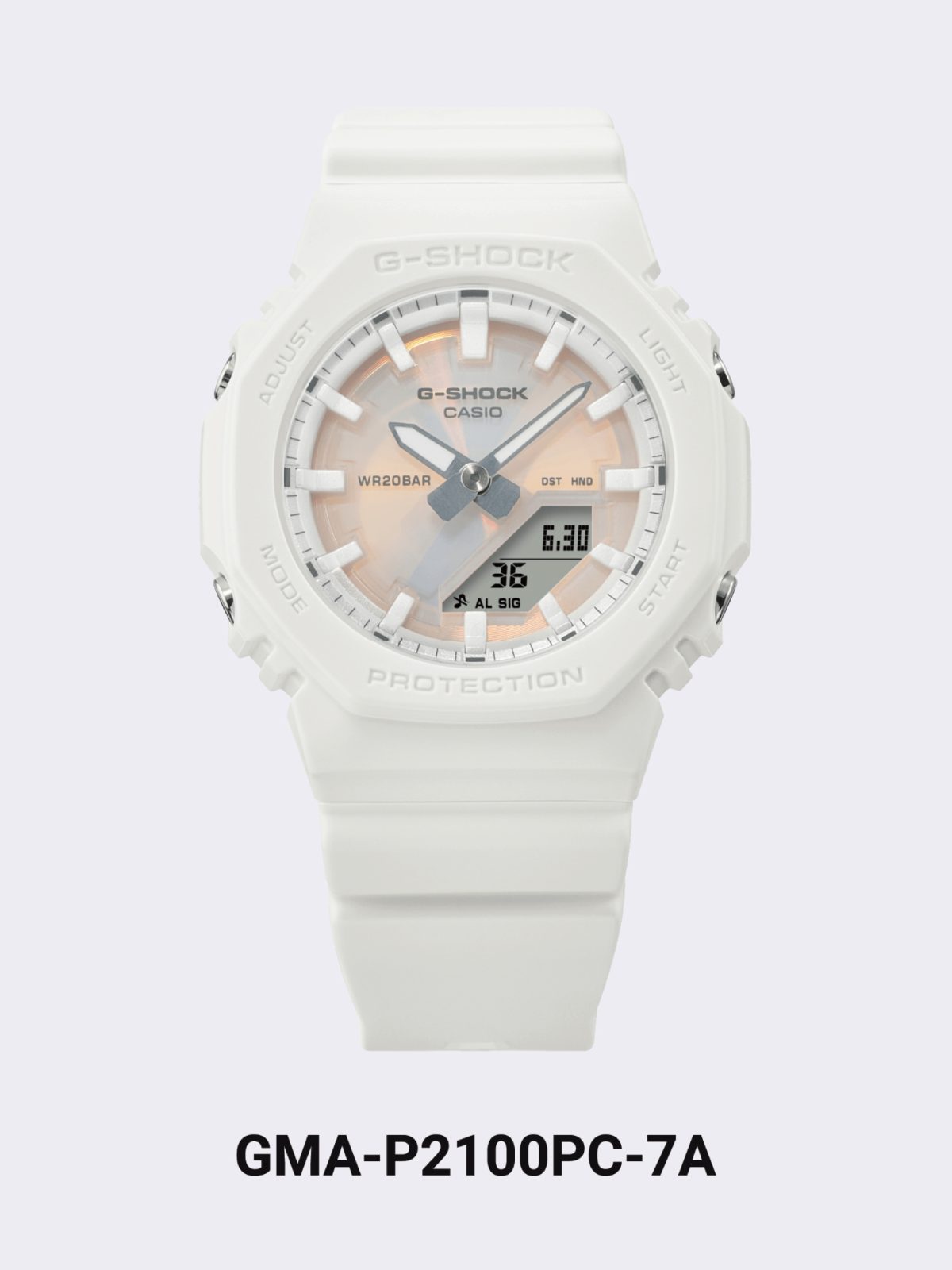 GMA-P2100-7A นาฬิการุ่นนี้ถูกตกแต่งด้วยสีขาวที่สว่างสดใสและดูงามหรู นำมาซึ่งรูปลักษณ์ที่อ่อนโยนและมีความเป็นผู้หญิงอยู่ในตัว