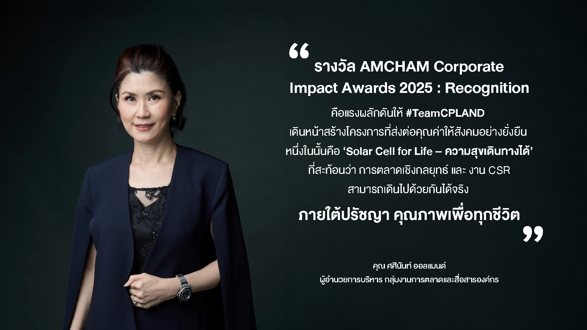 คุณศศินันท์ ออลแมนด์ ผู้อำนวยการบริหาร กลุ่มงานการตลาด และสื่อสารองค์กร กล่าวว่า รางวัลอันทรงเกียรติ AMCHAM Corporate Impact Awards 2025 ครั้งนี้ เป็นแรงผลักดันให้ #TeamCPLAND และเครือข่ายพันธมิตร เดินหน้าสร้างสรรค์โครงการที่สร้างคุณค่าเชิงบวกอย่างมีนัยสำคัญให้กับสังคมอย่างยั่งยืน หนึ่งในโครงการที่สะท้อนแนวคิดนี้ได้อย่างชัดเจนคือ ‘Solar Cell for Life – ความสุขเดินทางได้’ ความร่วมมือที่นำพลังงานแสงอาทิตย์เข้าไปช่วยยกระดับคุณภาพชีวิตของผู้คนในชุมชนห่างไกล โครงการนี้แสดงให้เห็นว่า การตลาดเชิงกลยุทธ์ และ ความรับผิดชอบต่อสังคม (CSR) สามารถเดินไปด้วยกันได้จริง เราไม่เพียงมอบแสงสว่างให้กับถนนในชุมชน แต่ยังสร้างโอกาสทางเศรษฐกิจ การขนส่ง การท่องเที่ยว และรายได้ให้กับคนในพื้นที่ ควบคู่กับการยกระดับความปลอดภัยและคุณภาพชีวิต ภายใต้ปรัชญา คุณภาพเพื่อทุกชีวิต – Accessible Communities for Life ซึ่งจะเป็นแรงขับเคลื่อนให้ #TeamCPLAND สานต่อโครงการนี้ เพื่อขยายผลให้เกิดประโยชน์กับผู้คนในทุกภูมิภาคอย่างยั่งยืน