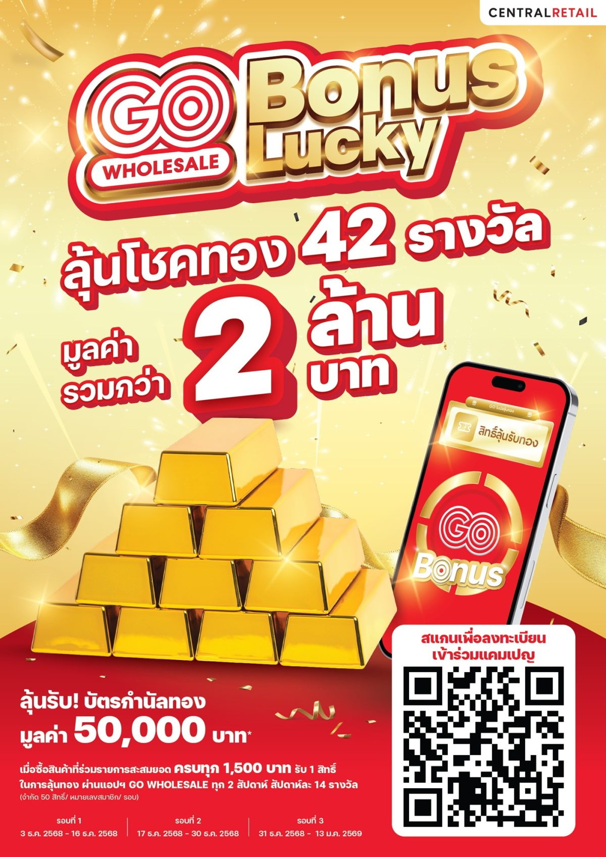 โก โฮลเซลล์ (GO WHOLESALE) ศูนย์ค้าส่งวัตถุดิบอาหาร ที่มีความสดใหม่ตลอดเวลาเพื่อผู้ประกอบการ ภายใต้การดำเนินงานของ บริษัท เซ็นทรัล ฟู้ด โฮลเซลล์ จำกัด ในเครือเซ็นทรัล รีเทล จับกระแสความต้องการทองคำของคนไทยที่ยังเติบโตต่อเนื่อง มาใช้เป็นมาร์เก็ตติ้งแคมเปญ ช่วงปลายปี เพื่อกระตุ้นกำลังซื้อ ภายใต้ชื่อ “GO Bonus GO Lucky” ที่ชวนให้ลูกค้าสมาชิกได้ลุ้นโชคเป็นทองคำ! เพียงซื้อสินค้าครบ 1,500 บาท มีสิทธิ์ทันที กับการลุ้นรับทองคำทุกสองสัปดาห์ สัปดาห์ละ 14 รางวัล รวม 42 รางวัล มูลค่ากว่า 2 ล้านบาท รวมถึงยังมีส่วนลดพิเศษจาก 20 แบรนด์พันธมิตรเข้าร่วมแคมเปญนี้ด้วย